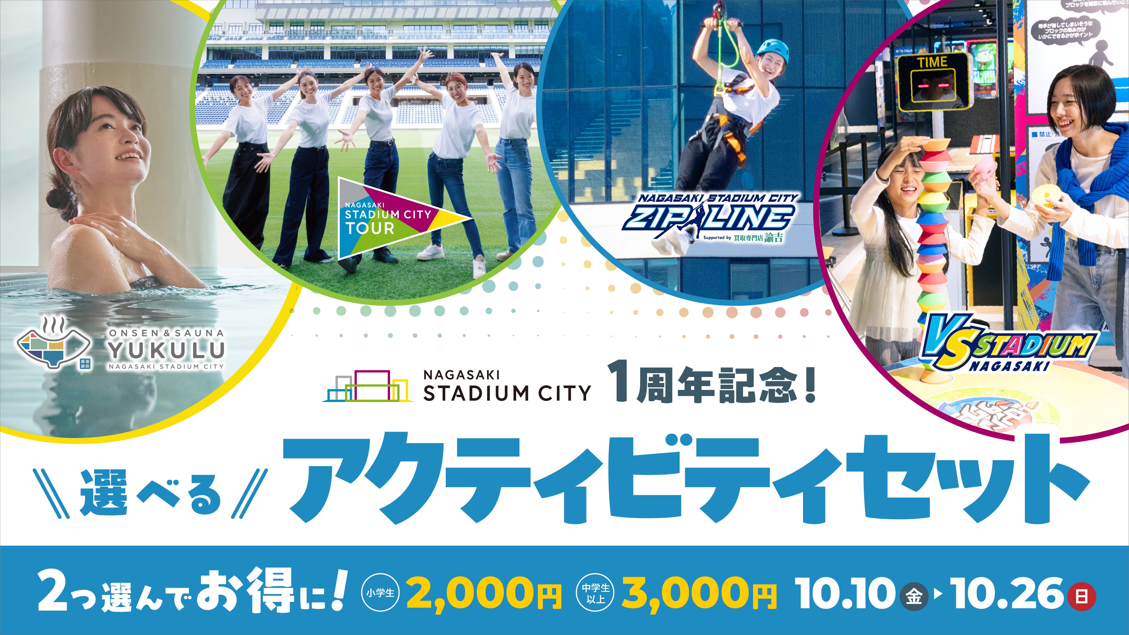 「VS STADIUM」「ONSEN&SAUNA YUKULU」「ジップライン」「長崎スタジアムシティツアー」の4つのアクティビティから2つを、大人は3,000円/小学生以下は2,000円で楽しめる記念プランを用意いたしました。