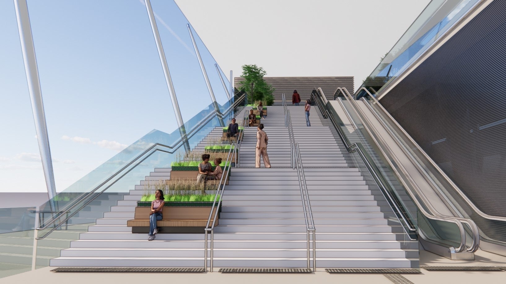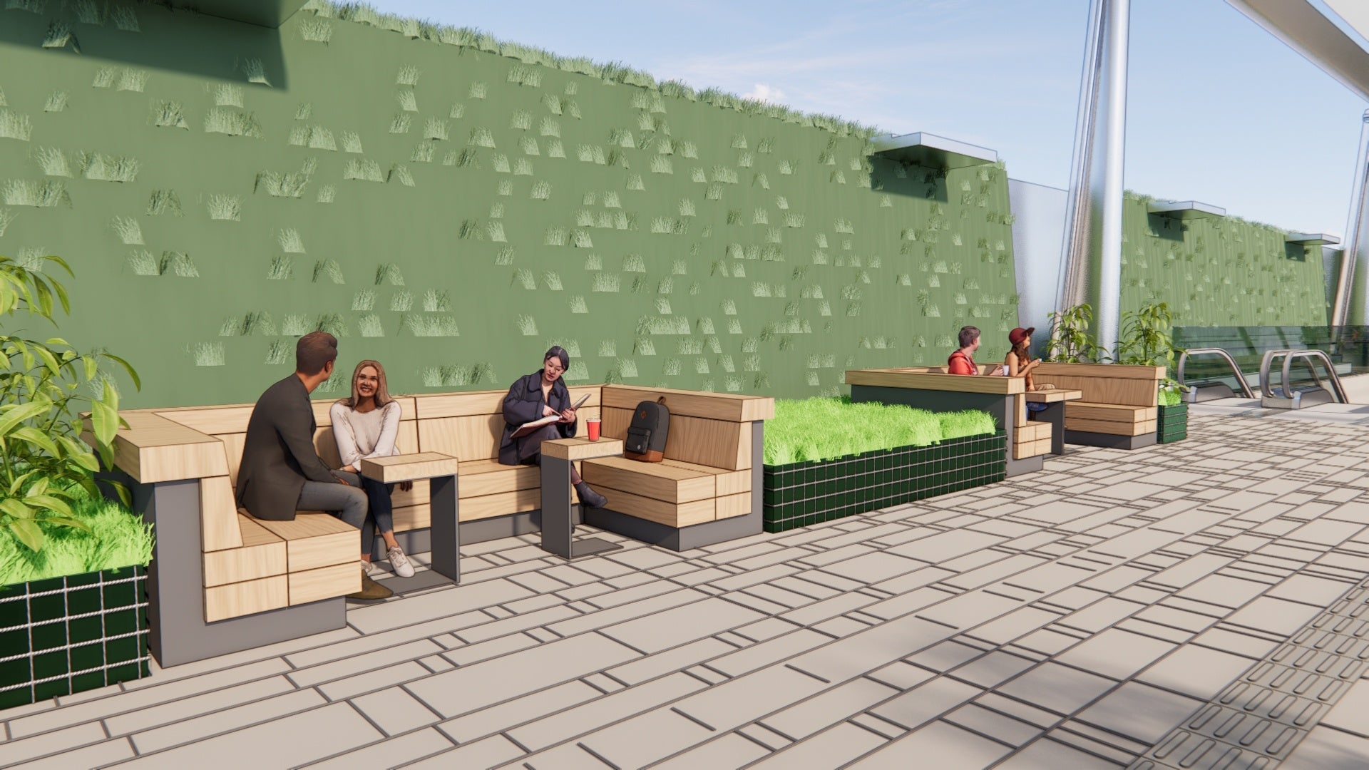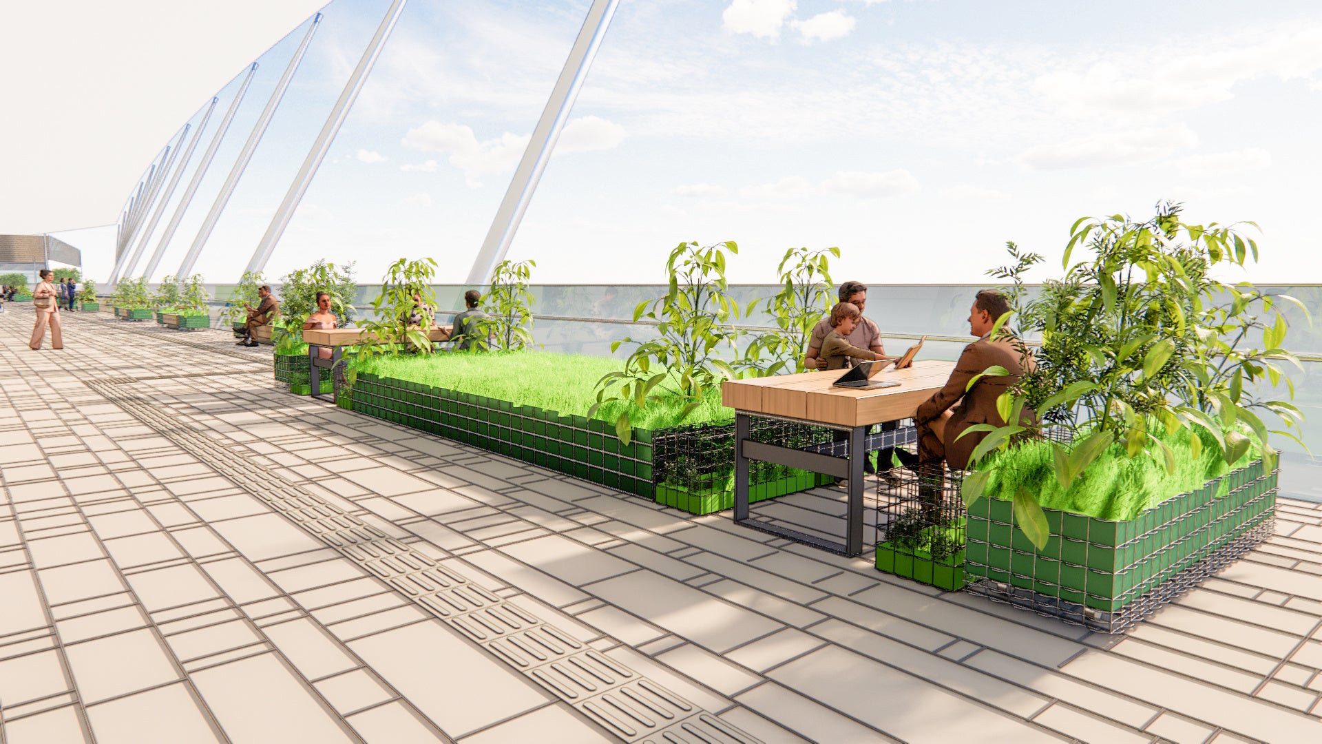 ・234mにわたるペデストリアンデッキの長さを活かして多様な空間を整備し、駅・高速バス利用者、周辺のオフィスワーカー、住民、来街者等、誰でも快適に過ごせるパブリックスペースを創出します。エリア全体でフリーWi-Fiや電源コンセントを整備します。