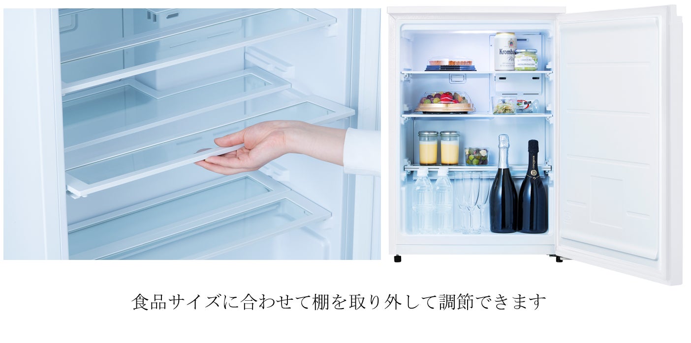 今回発売する「奥行スリム冷蔵庫 66L」は、奥行が39cmで、背面を壁につけて設置でき(※1)、テレビ台や本棚などのインテリアと奥行きを合わせやすいことに加えて、シンプルなデザインとマットな質感により、リビングや書斎にも調和します。また、ガラス棚は取り外し可能なため、保存する食品のサイズにあわせて調節でき、高さのあるワインボトルや2Lペットボトルを収納できます。さらに、省エネ基準達成率(※2)は約312%を実現し、電気代を抑えられます。