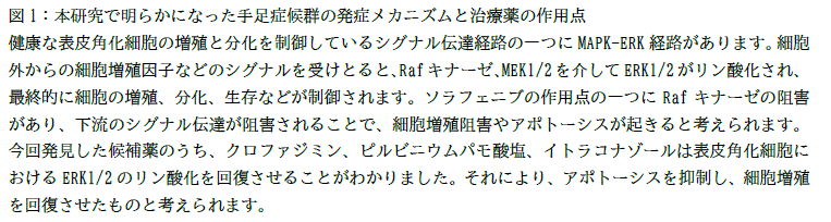 今回、研究グループは発症メカニズムが不明で治療法も対症療法だけであった、分子標的型抗がん剤による手足症候群の発症メカニズムの一端を解明し、治療薬の候補となる物質を発見しました。このたびの研究はすべてin vitro(*14)で実施されたため、実用化に当たってはさらに基礎と臨床をつなぐトランスレーショナルリサーチ(橋渡し研究)が必要です。今回、同定した候補薬は既に国内で承認され医療に用いられている既存薬であることから、早期に新規治療法として応用できる可能性があります。特にイトラコナゾールと同系統のアゾール系抗真菌薬は外用薬もあり、皮膚科領域で汎用されていることから、研究グループでは倫理委員会の承認を得た上で、抗真菌薬クリームの手足症候群への治療効果について臨床試験を進めています。皮膚に塗布する外用剤であれば、がん治療に支障をきたす可能性が少ないことから、本治療法が適用されれば、既存の外用薬により手足症候群の症状が軽減し、がん治療中の患者さんの生活の質が向上することが期待されます。今回、候補薬は共通してアポトーシス阻害作用を示しましたが、細胞増殖促進作用やERK1/2リン酸化の正常化作用は候補薬により、違いがあったため、個々の候補薬の細胞保護メカニズムに関しても解析を進めて行きます。