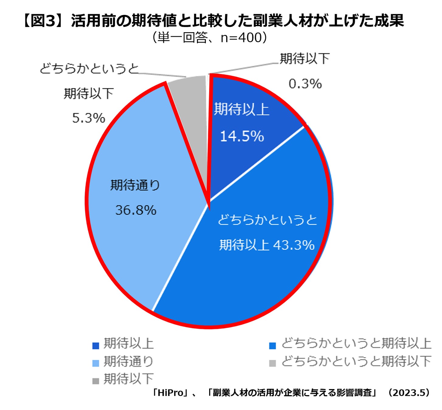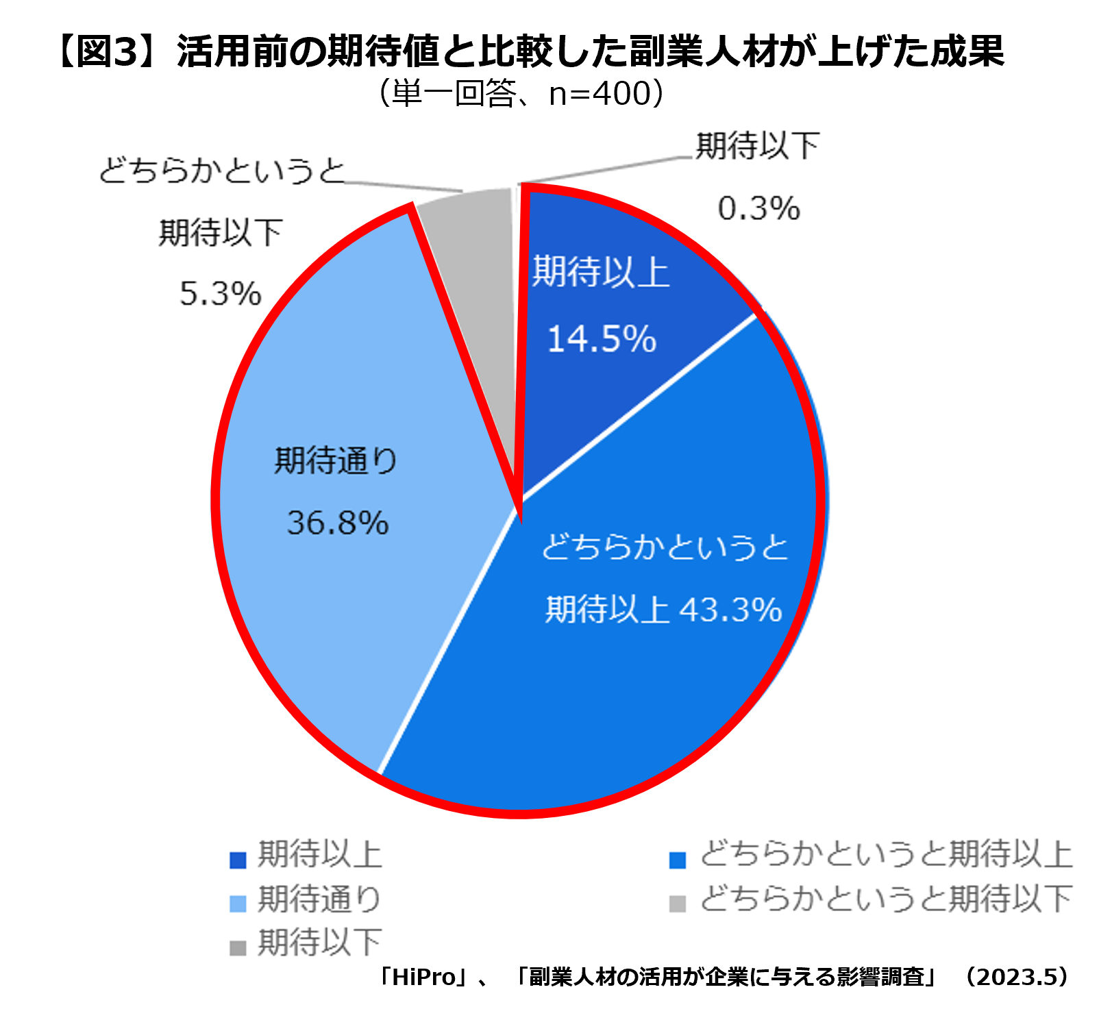 次に、「副業人材の成果」について聞いたところ、94.6%の企業が活用前の期待値と比較して「期待以上」「期待通り」と回答。(【図3】参照)