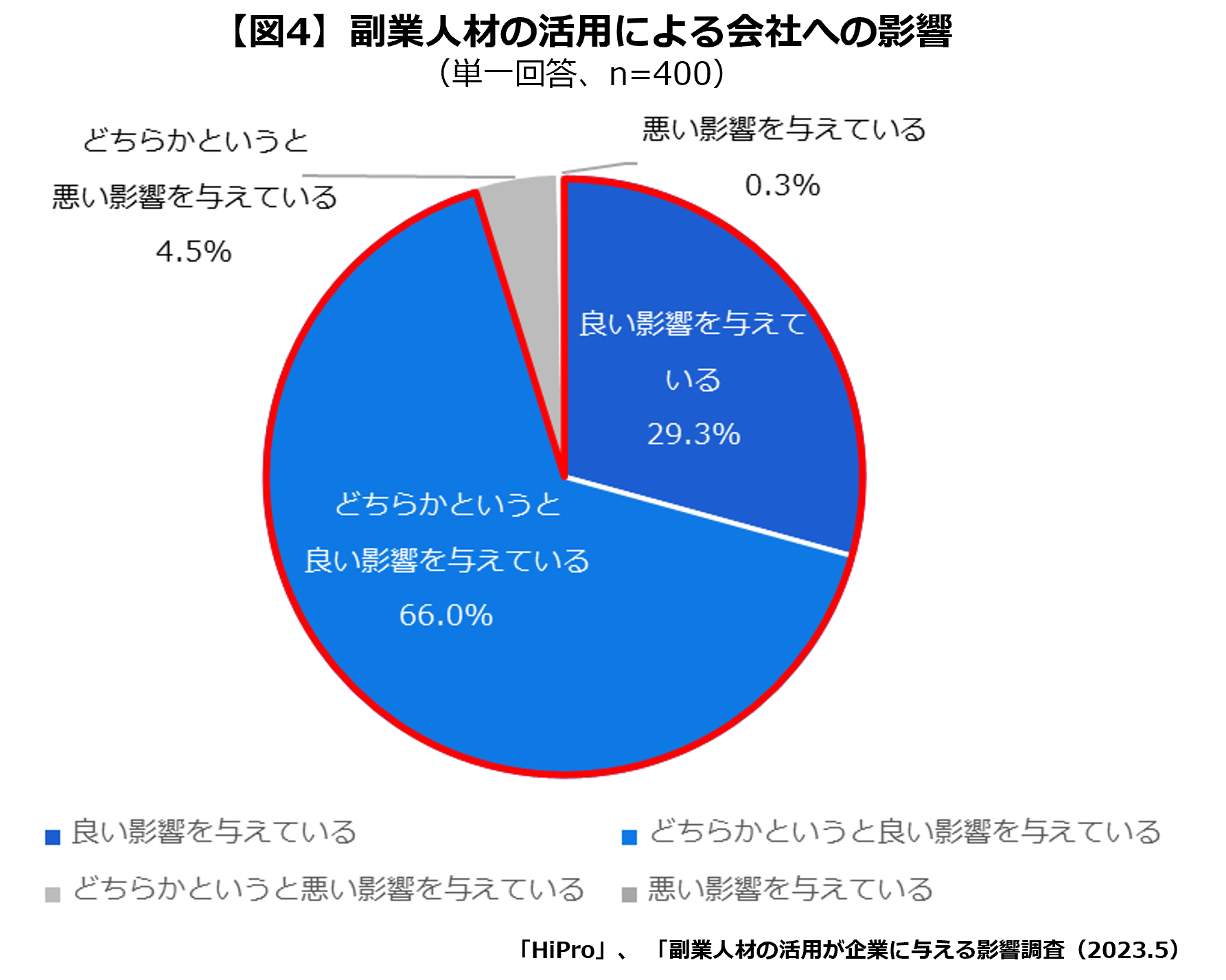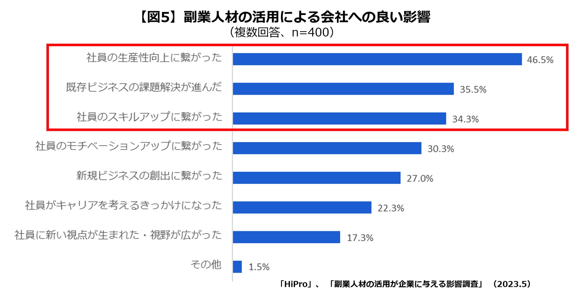 また、「副業人材の活用が会社に良い影響を与えているか」の問いに、95.3%が「良い影響を与えている」と回答し、その理由として「社員の生産性向上(46.5%)」「社員のスキルアップ(34.3%)」が上位に挙がりました。これにより、副業人材の活用は、会社の事業やサービスだけではなく、「人への投資」の目的の1つでもある、自社社員の生産性やスキル向上に寄与することを裏付ける結果となりました。(【図4】、【図5】参照)