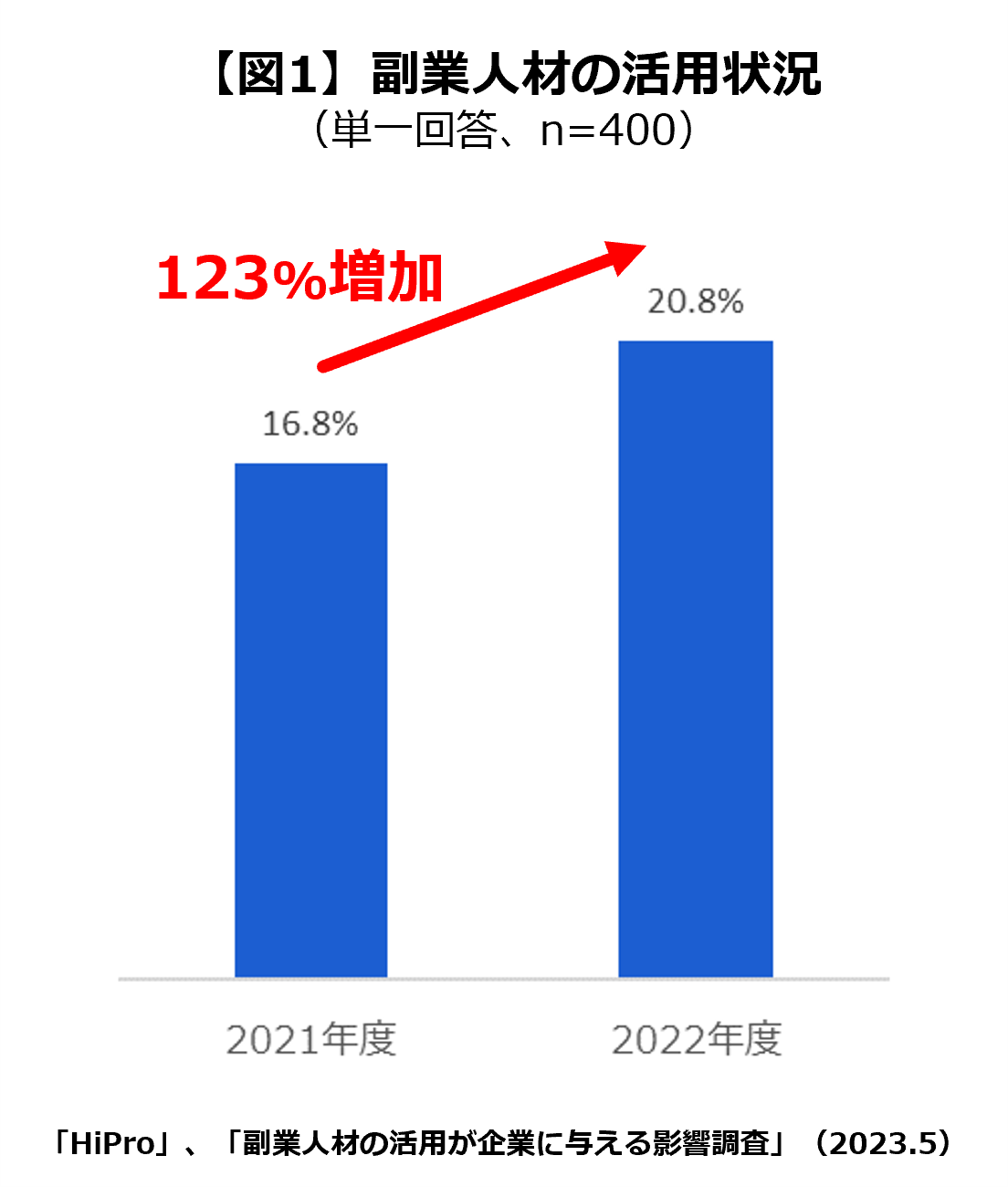 ■2022年度(2022年4月~2023年3月)に副業人材の活用を開始した企業は、前年度比123%増加。