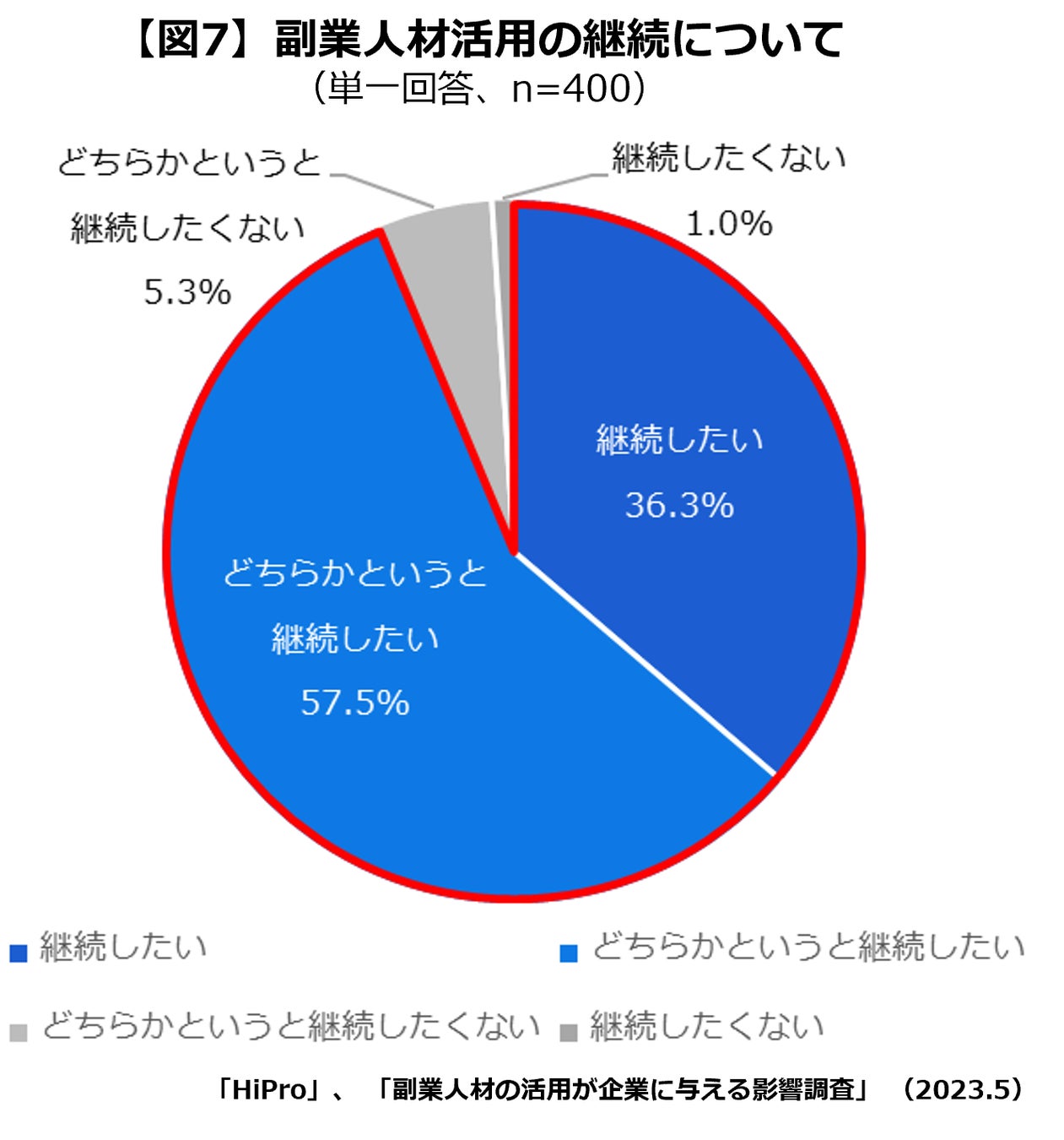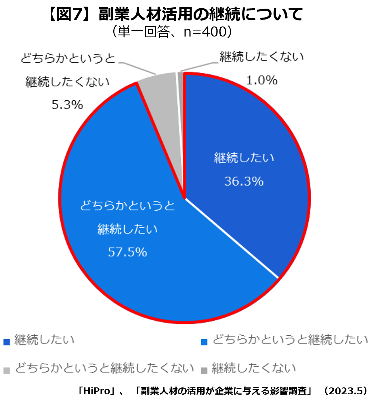 現在、副業人材を活用している企業の93.8%が「今後も副業人材の活用を継続したい」意向であることが判明し、さらに市場が盛り上がる兆しが伺える結果となりました。(【図7】参照)