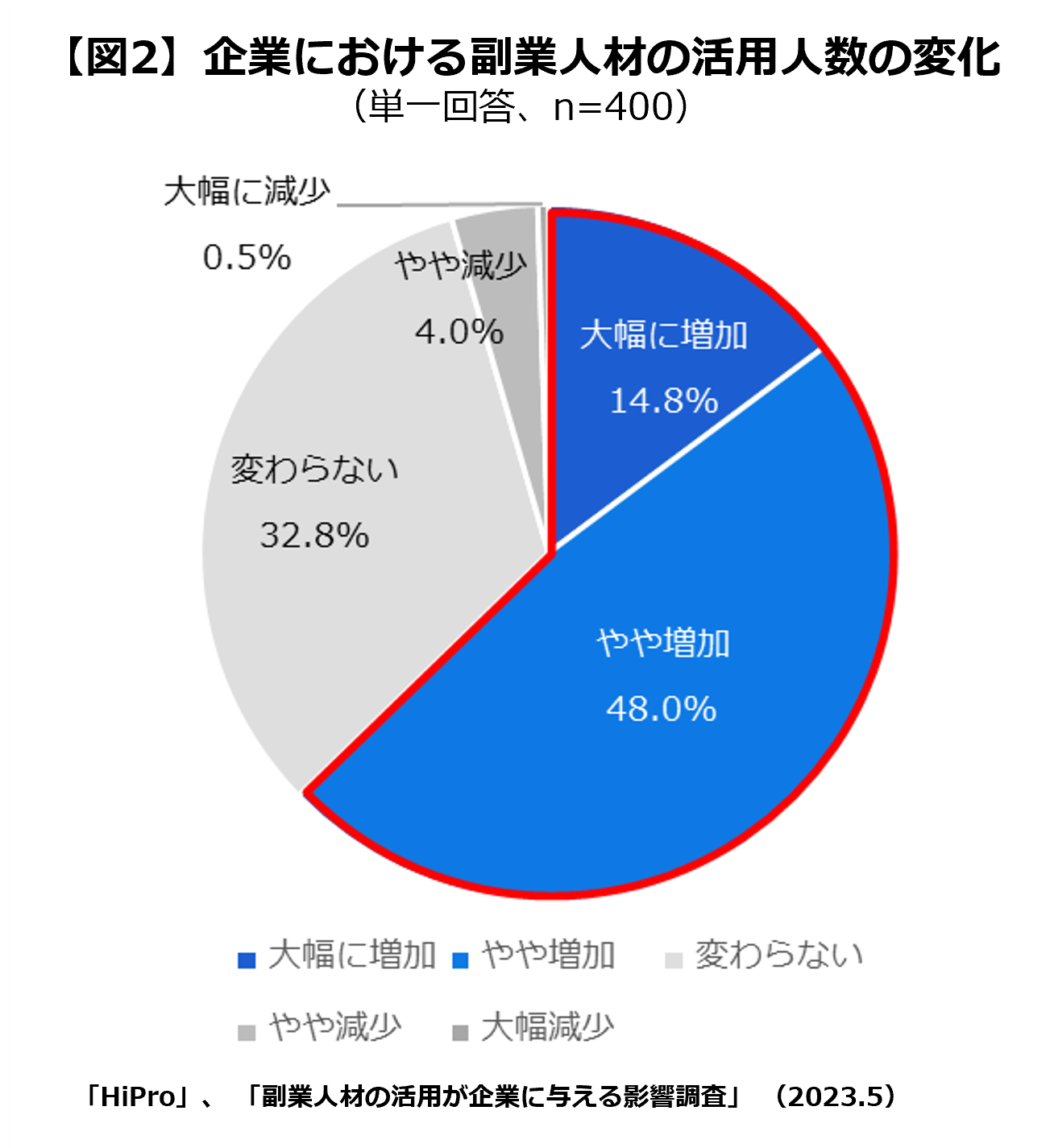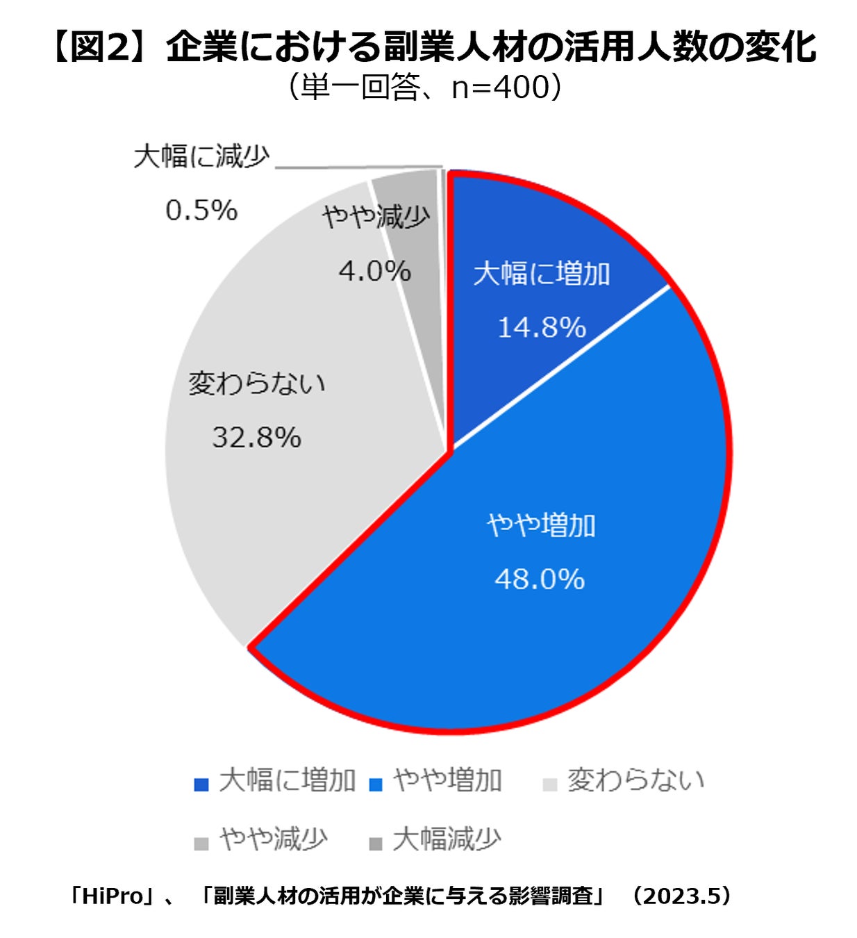 副業人材を活用中の企業のうち、62.8%で活用人数が増えていることも明らかに。