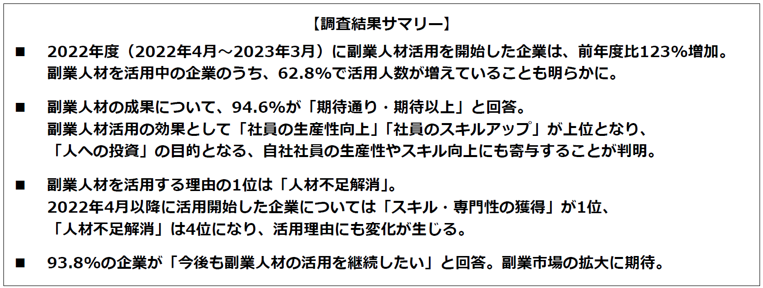 また、副業人材がもたらす自社社員への効果や成果が明らかになっていくことで、人手不足の解消の手段としてだけでなく、自社に新たな価値をもたらす手段として、より副業人材の活用が広がる日も近いでしょう。
