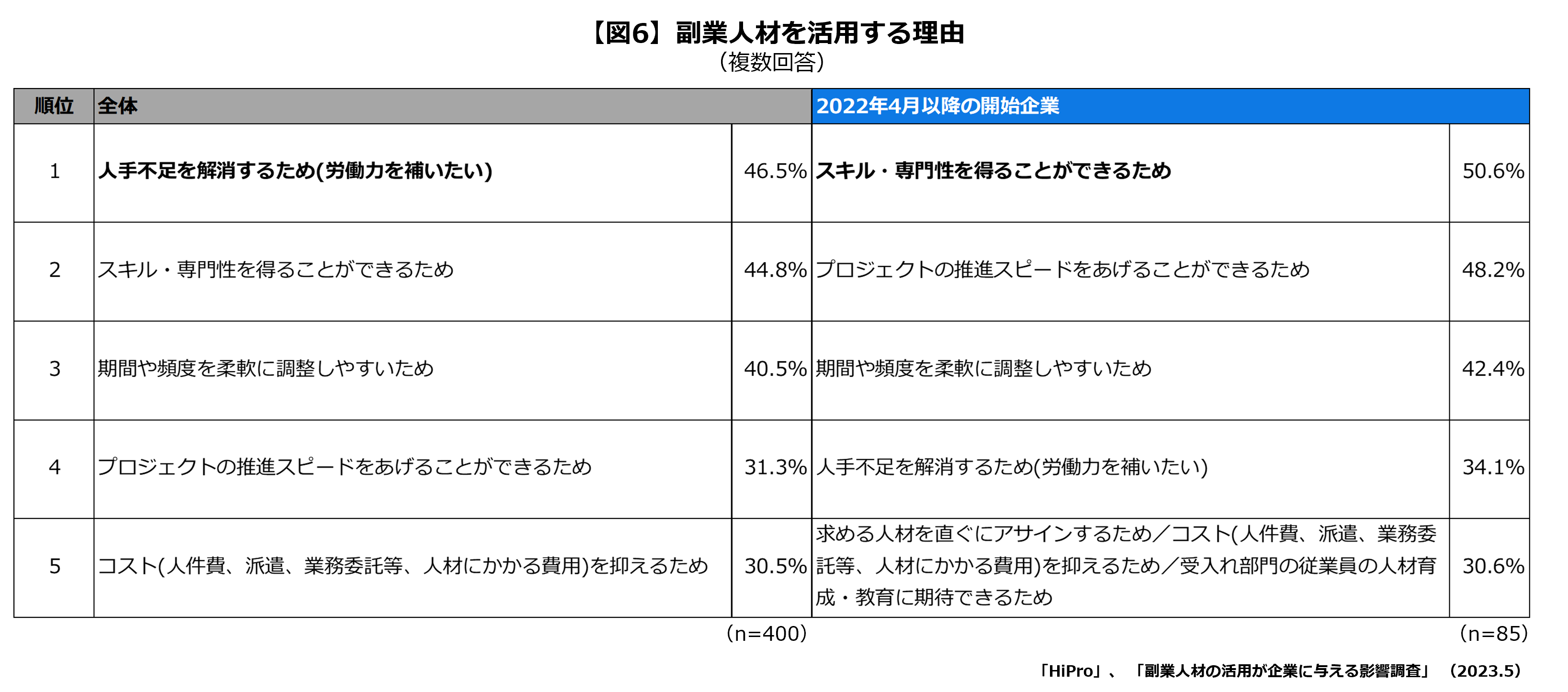 ■副業人材を活用する理由の1位は「人材不足解消」。一方、2022年4月以降に活用開始した企業は「スキル・専門性の獲得」が1位となり、活用理由に変化が生じる。