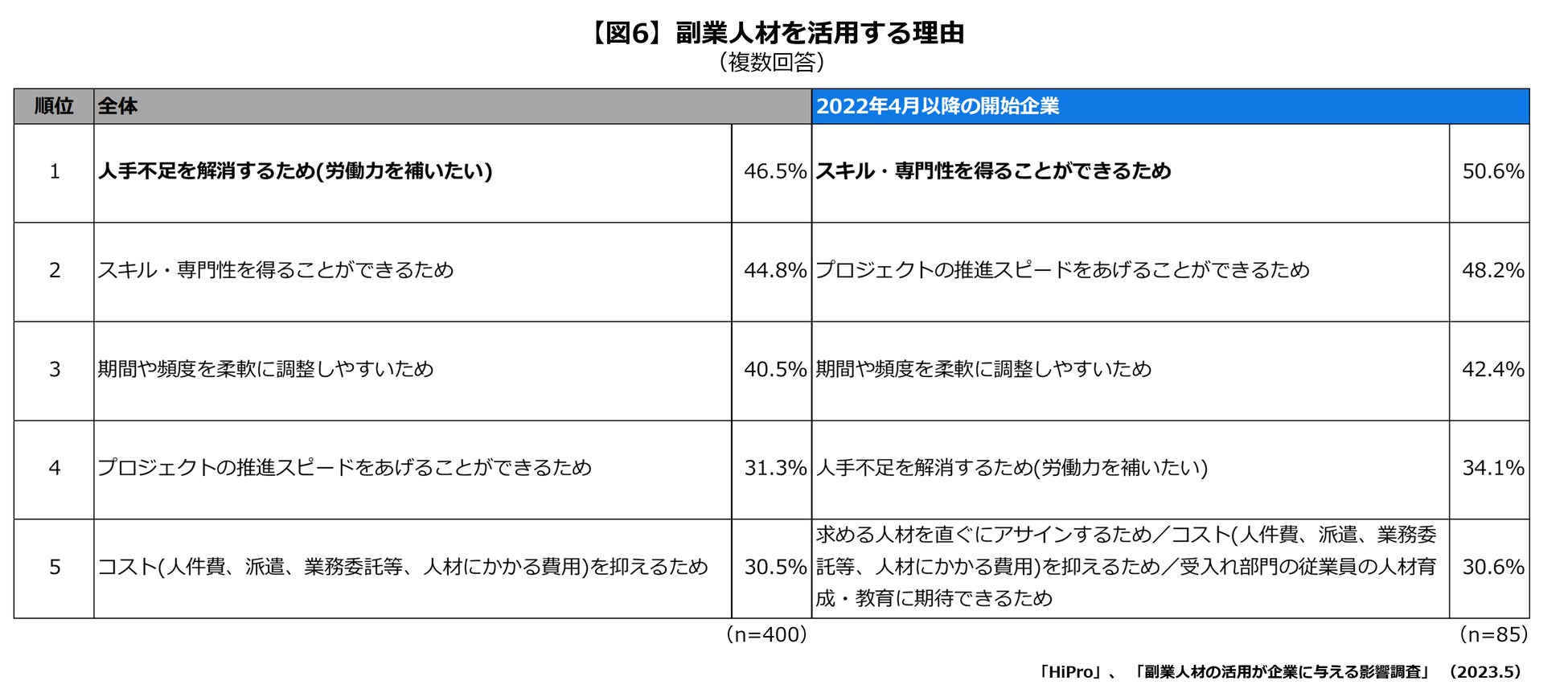 副業活用を行っている企業の管理職に活用理由について聞いたところ、1位が「人材不足の解消(46.5%)」となりました。一方、2022年4月以降に活用を開始した企業の管理職に絞ると、1位「スキル・専門性の獲得(50.6%)」、2位「プロジェクト推進のスピードアップ(48.2%)」、3位「調整のしやすさ(42.4%)」となり、副業活用理由に変化が生じていることがわかります。(【図6】参照)