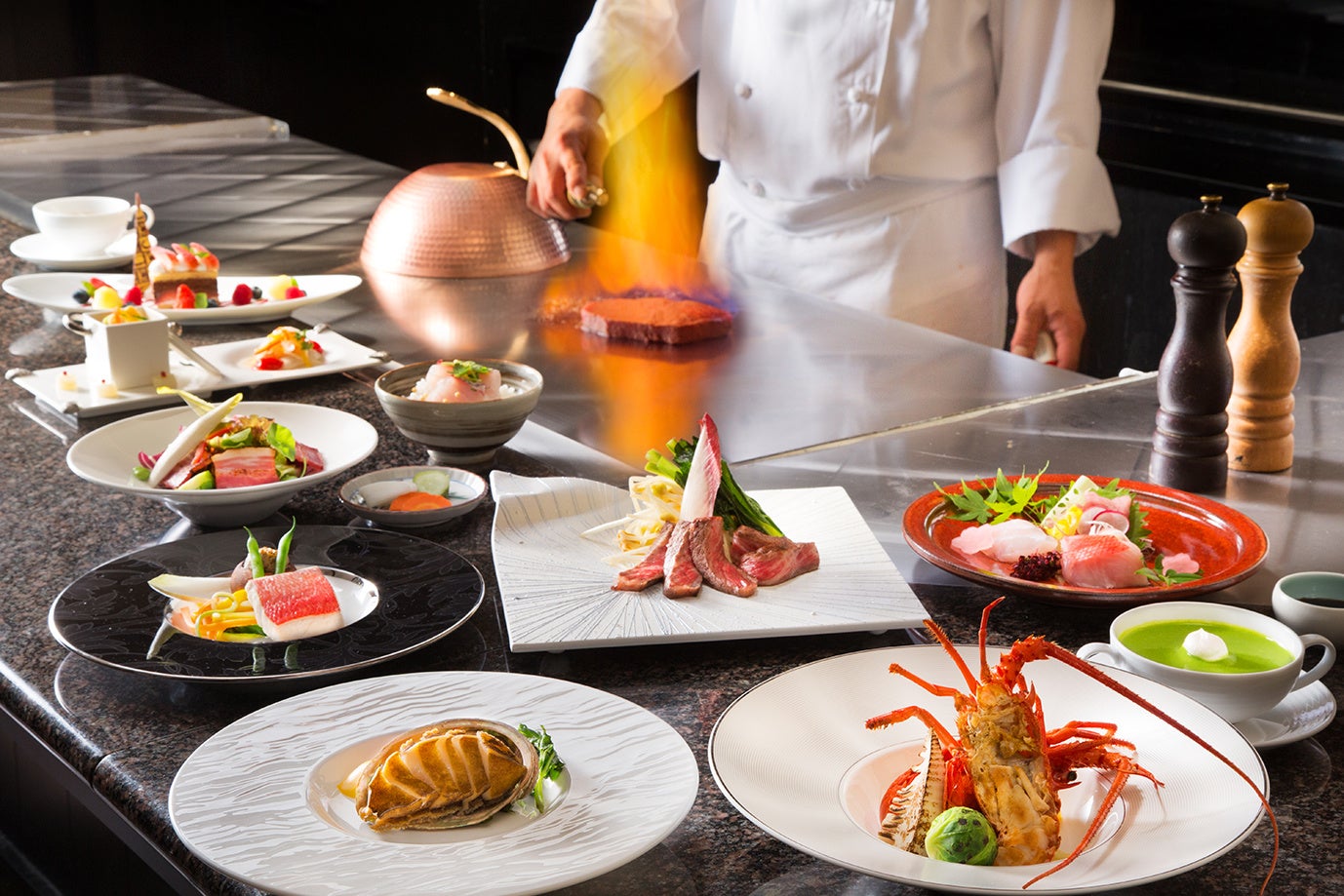 中庭に面した海を見下ろす大きな窓が、開放感あふれる空間を演出します。時とともに表情を変える海を眺めながら美味しいひと時をお過ごしください。チェックイン後はふわふわのパンケーキでアフタヌーンティー、ディナーでは金目鯛や伊勢海老、肉料理を鉄板焼で贅沢にお召し上がりいただけます。