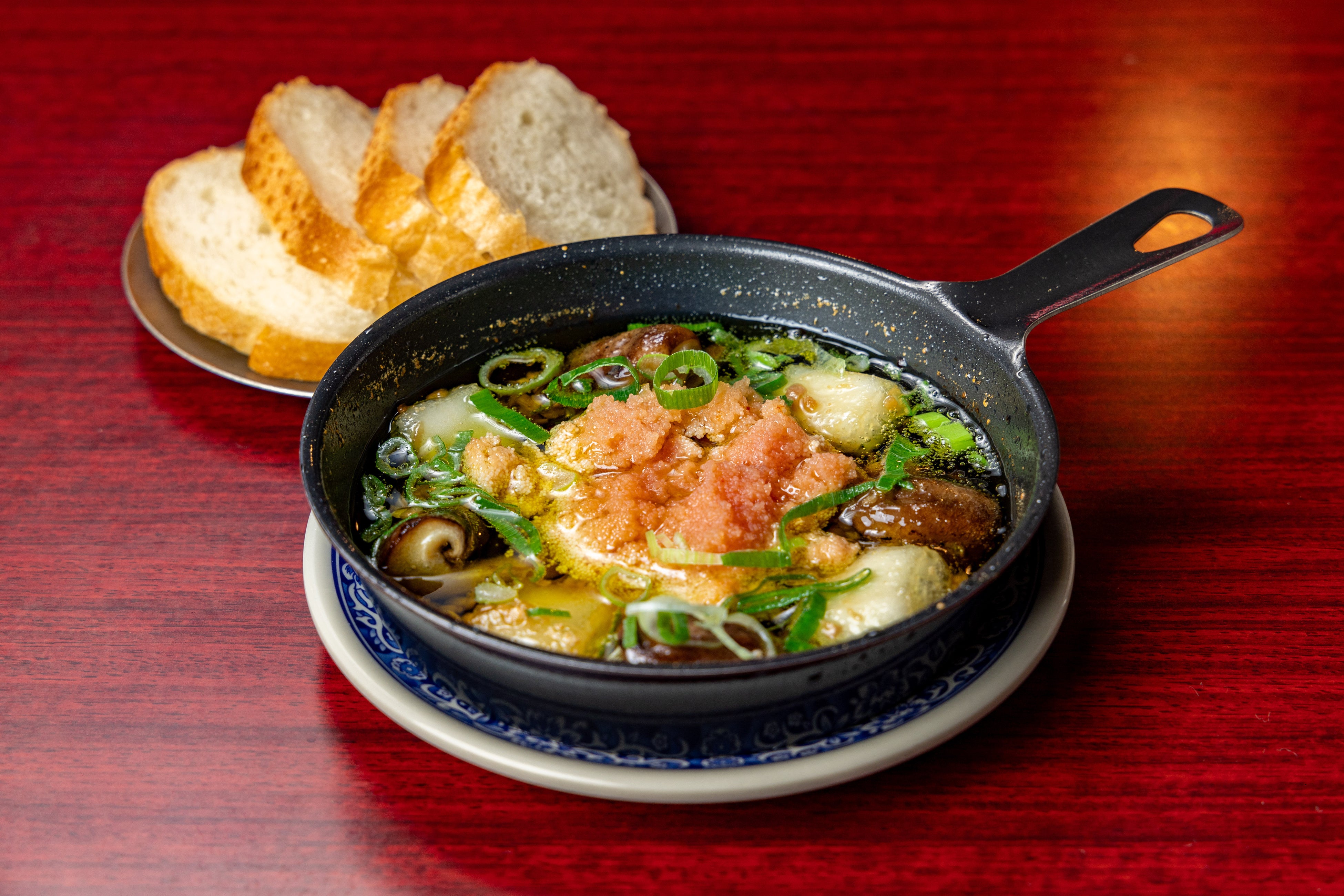 鉄板/明太子とキノコのアヒージョ バケット付き 980円(税込1,078円)