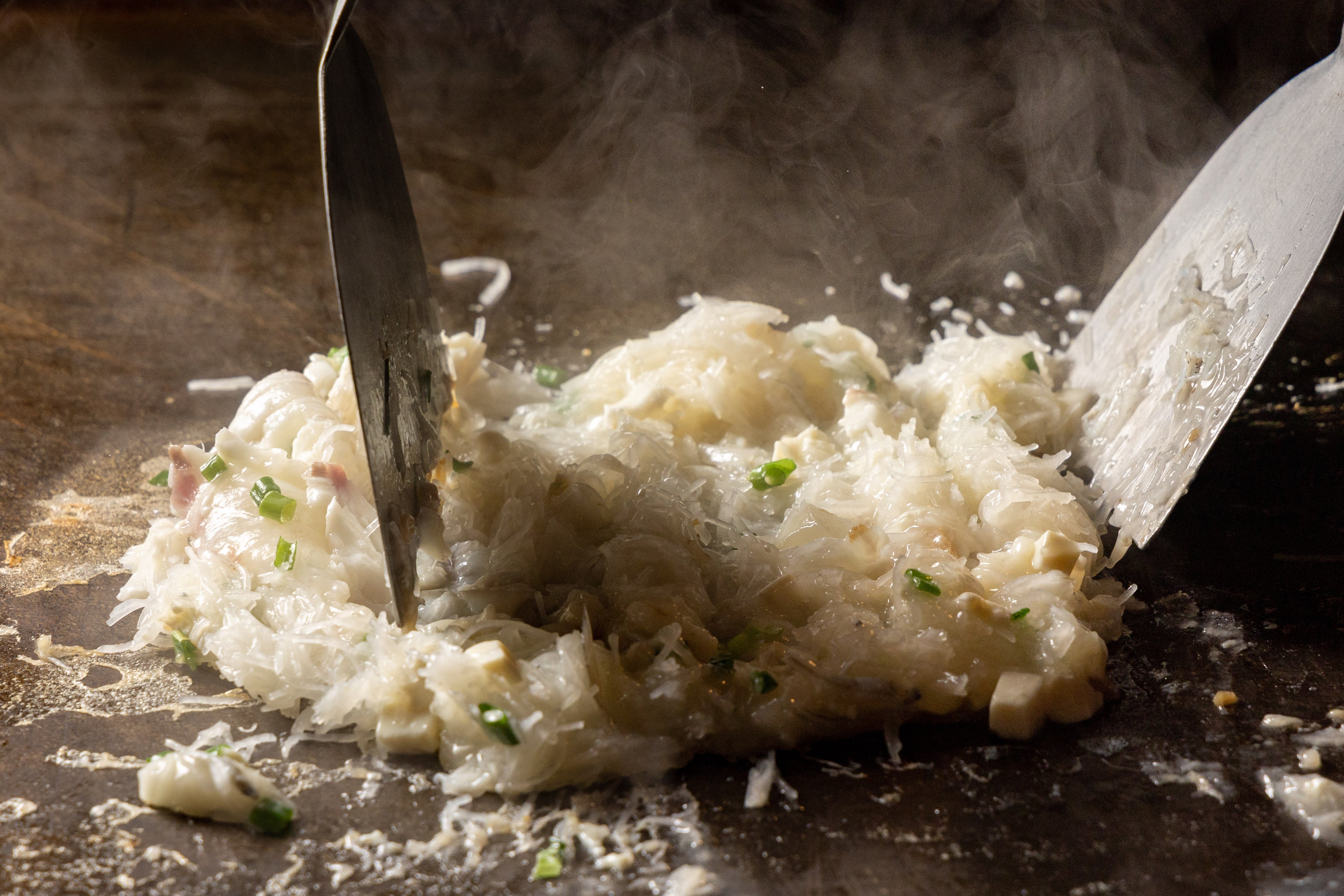 もち粉、豆腐、大根のつま、お餅をベースとする「餅もんじゃ」の一番の味わいは【おこげ】にあり。おこげを最大限に楽しんで頂きたいので、極力薄く、広く伸ばして、おこげを味わっていただきます。