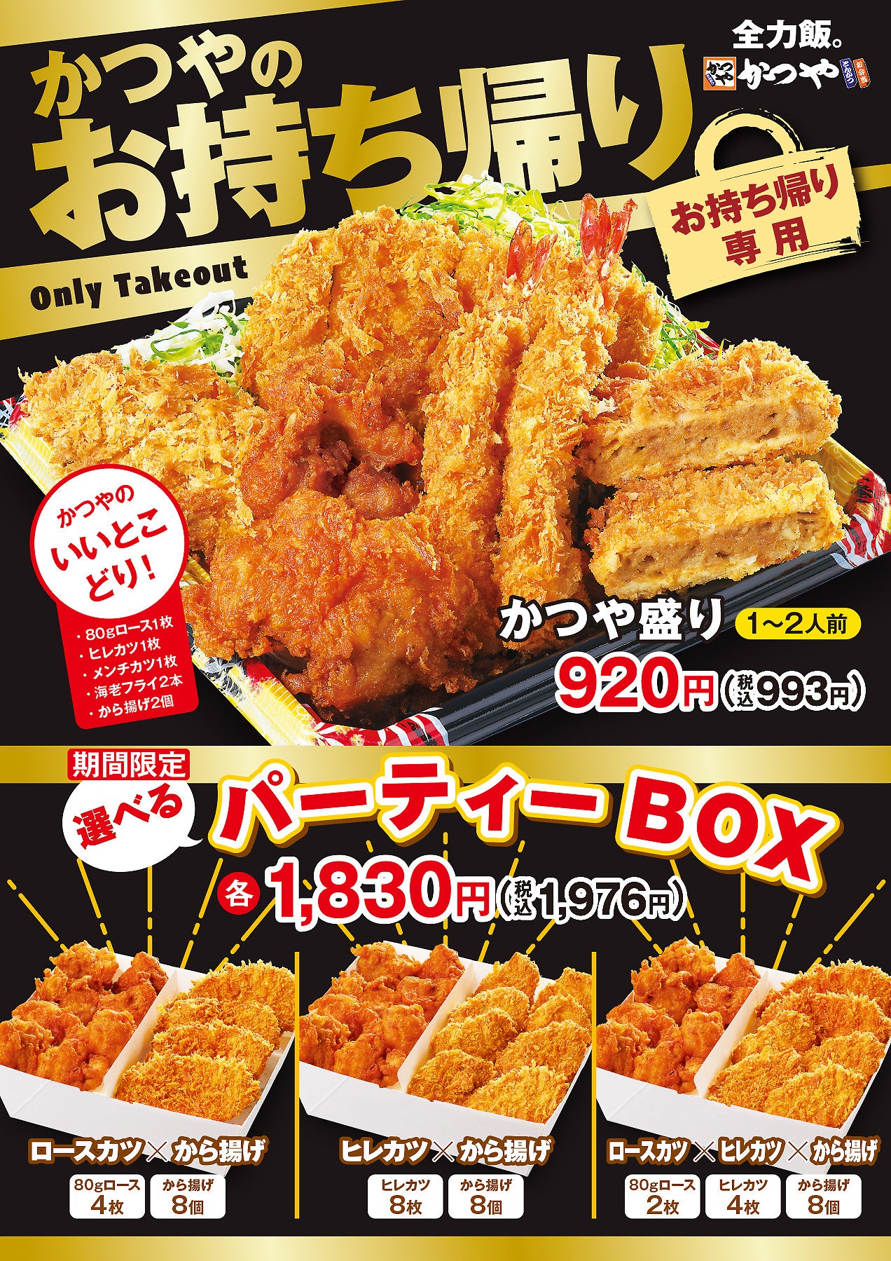 とんかつ専⾨店「かつや」を展開している株式会社かつや(本社:東京都千代⽥区/代表:⼤内 勇⼀)は、国内「かつや」にて、テイクアウト限定の新商品「かつや盛り」と期間限定メニュー「選べるパーティBOX」3種を2022年4月22日(金)より期間限定で販売いたします。