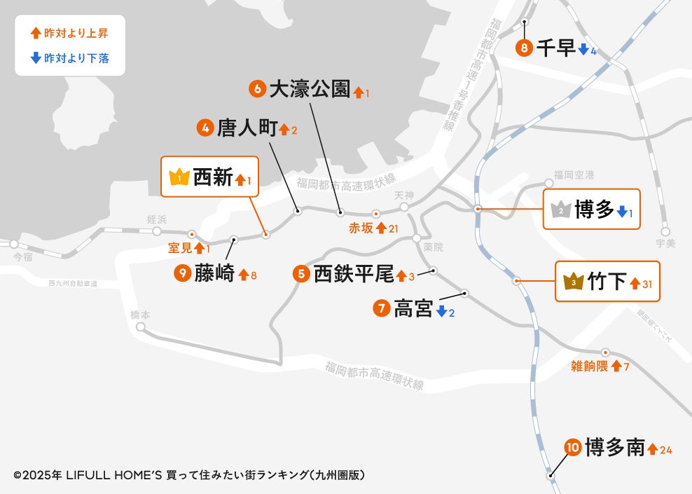 購入物件への問合せ数を集計した「2025年 LIFULL HOME'S買って住みたい街ランキング(九州圏版)」は、福岡市地下鉄空港線の「西新」が前々回12位、前回2位からランクアップして初の1位を獲得し、「博多」の3年連続2冠を阻止しました。また、福岡市地下鉄空港線および西鉄天神大牟田線の人気が高く、上位はほぼこの2線が独占しています。