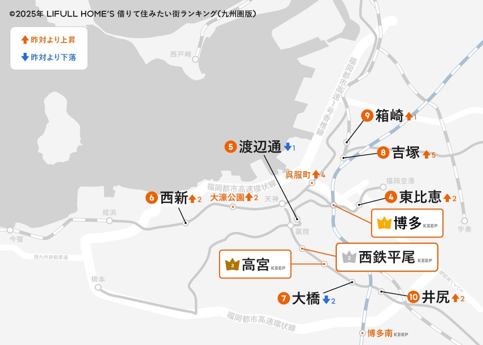賃貸物件への問合せ数を集計した「2025年 LIFULL HOME'S 借りて住みたい街ランキング(九州圏版)」は、「博多」が8年連続トップとなりました。2位「西鉄平尾」、3位「高宮」も前回と同じ順位で、TOP3の駅に変化はありませんでした。1位の「博多」は事業集積性と交通利便性が西日本でも突出して高く、2位「西鉄平尾」と問合せ数の差は1.7倍あるため、今後もトップを維持する可能性が高いです。