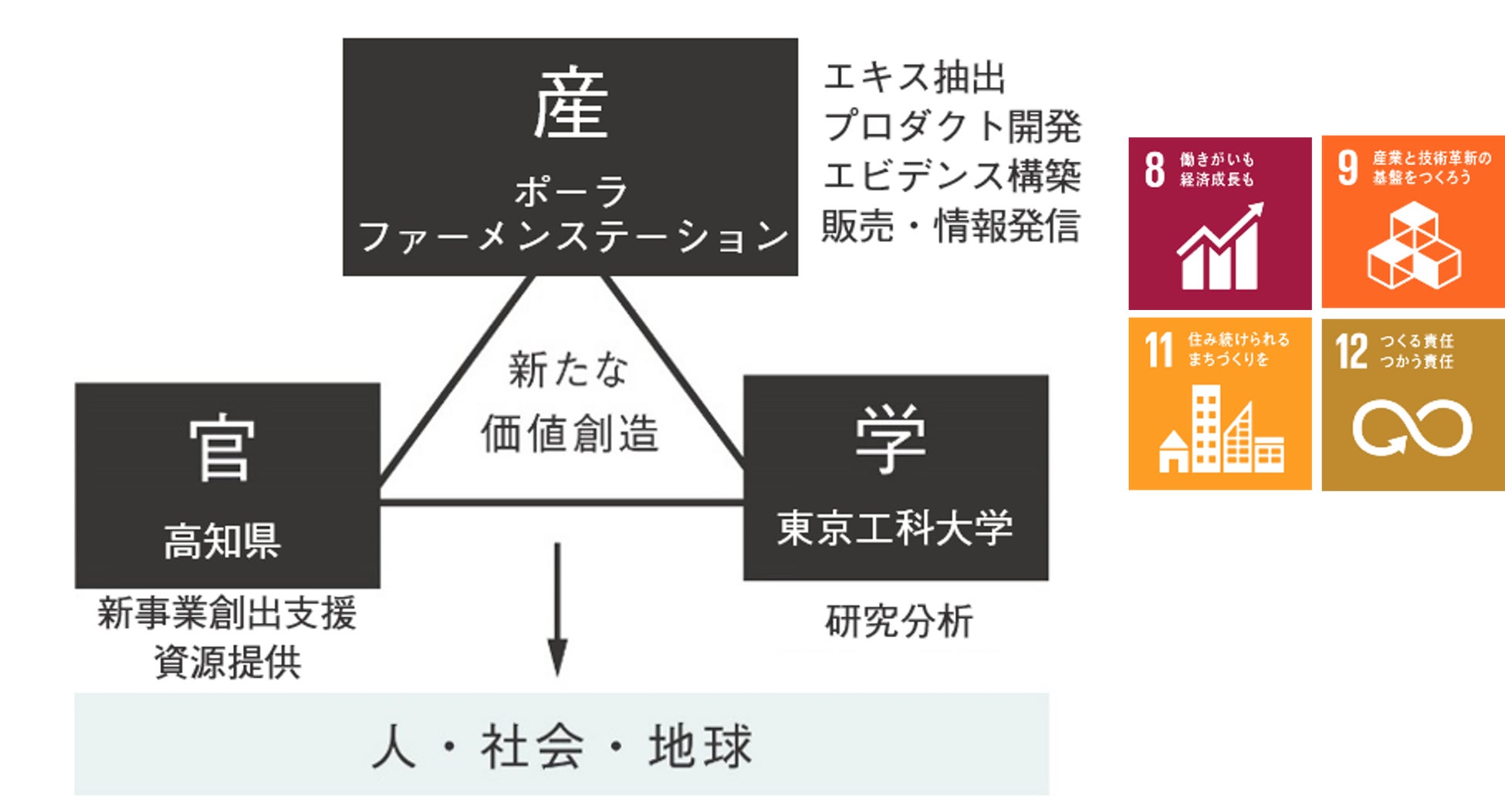 高知県は眠っていた資源の提供、ポーラは、発酵を通して未利用資源を活用し、サステナブルな循環社会をつくるという理念をもつファーメンステーションに共鳴し、ともにエキスの抽出やプロダクト開発を、そして東京工科大学はエキスの検証・分析と、産官学が連携して取り組みました。