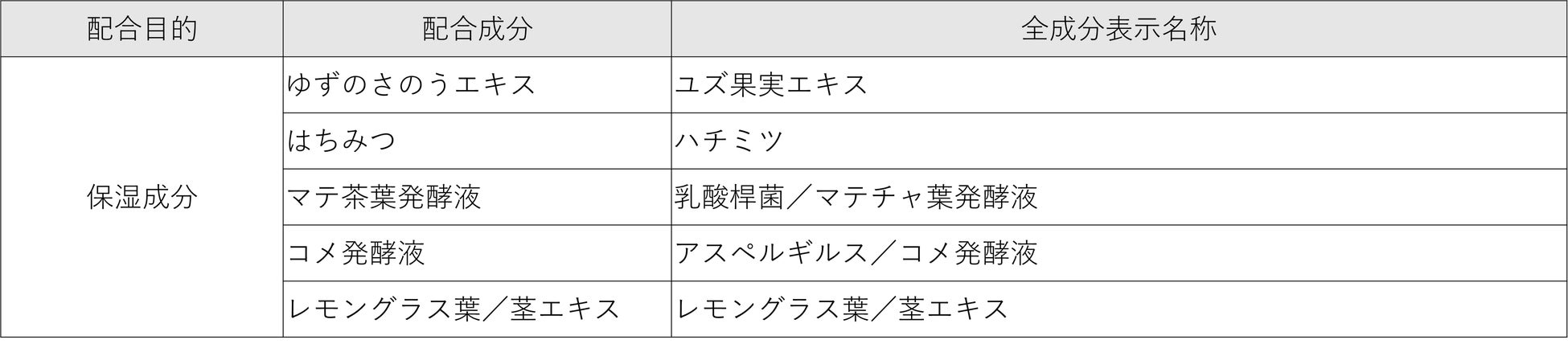 その他、保湿成分「はちみつ」「マテ茶葉発酵液」「コメ発酵液」「レモングラス葉/茎エキス」配合。