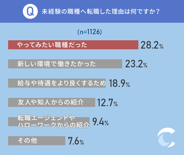 未経験職種へ転職した理由としては、「やってみたい職種だった」が28.2%ともっとも多く、やってみたかった職種に挑戦したという場合が多いようです。