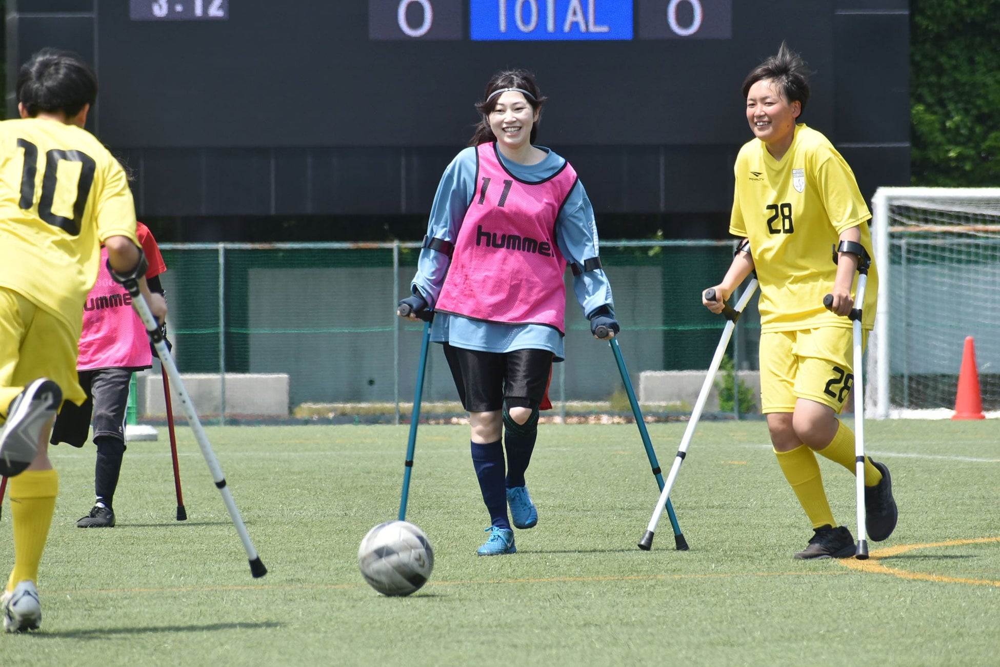 半月板のケガでサッカーができなくなり、片足でできるスポーツを探していたという新井鐘子さんは、レオピン杯に初参加。「子どもの頃は男子の中に1人女子でプレーすることもあったし、フットサルでも男女で楽しんでいたのですが、やっぱりこうして女子だけのアンプティサッカーをして、女友だちの輪が広がっていくっていいですね」と話しました。