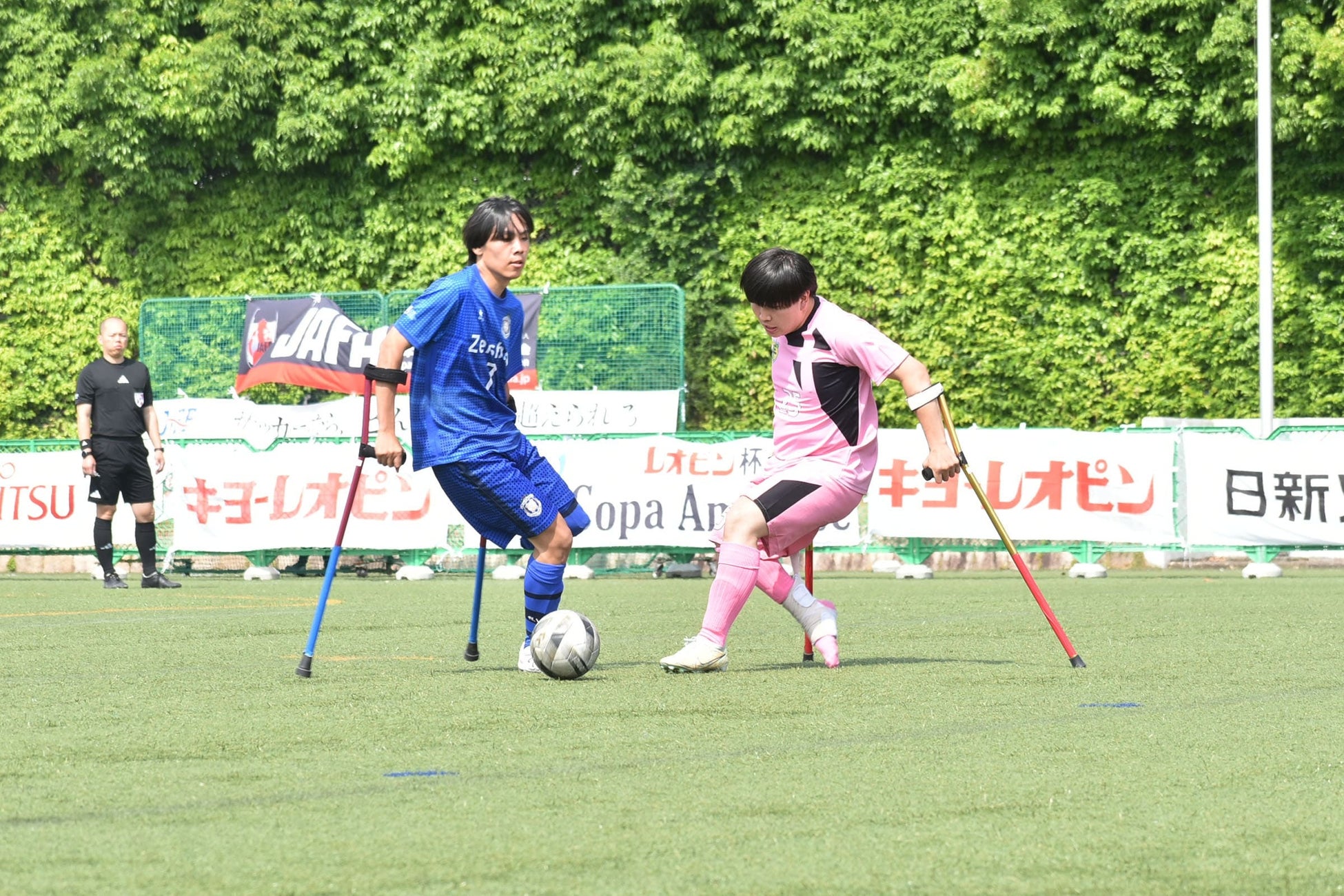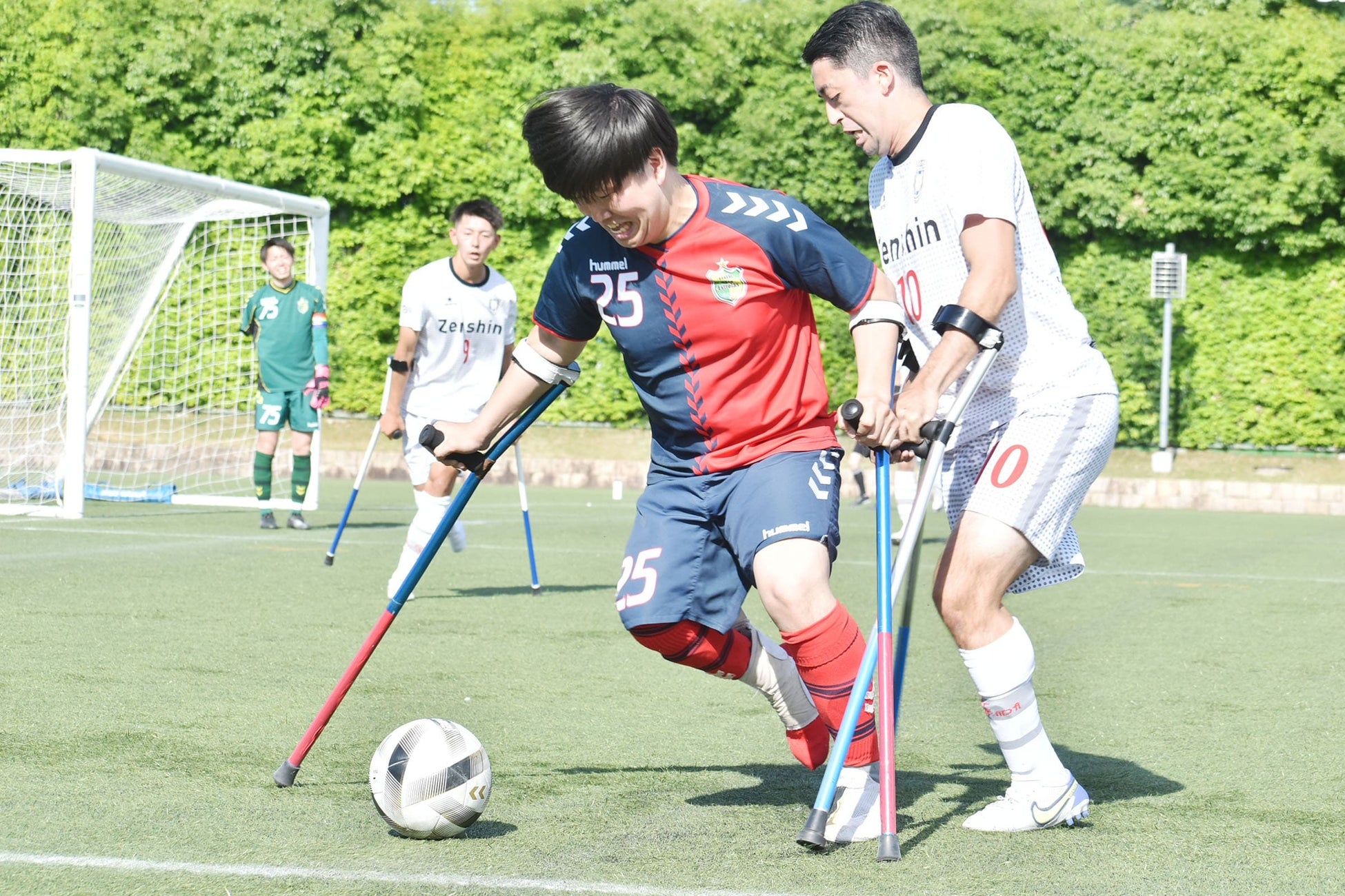 30年以上前にアメリカの負傷兵が松葉杖をついてプレーするサッカーを、リハビリテーションとして始めたのが競技のきっかけ。フィールドプレイヤーは主に片足の切断者で、日常生活で使われる松葉杖(ロフストランドクラッチ)をついてプレー。GKは主に片手を切断しており、欠損部の程度に関わらず、片腕でゴールを守ります。フィールドプレイヤー6名とGK1名の7人制サッカーで、日本には2010年に導入。秋に川崎市で行われる日本選手権とともに、春のレオピン杯の2大会が全国大会として実施されています。