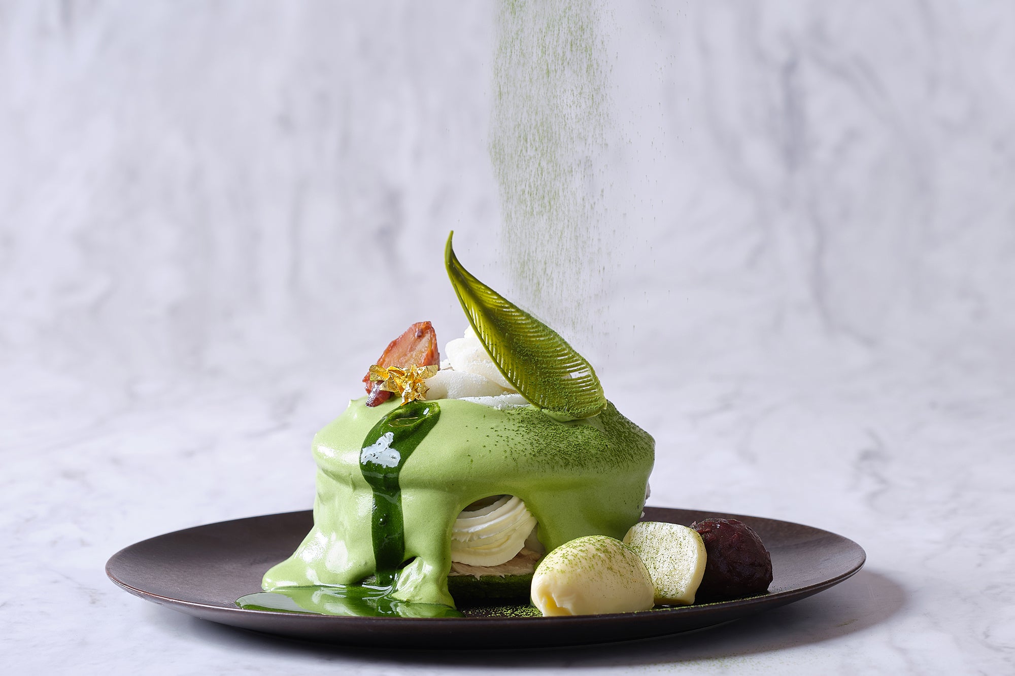 抹茶を練りこんだパンケーキの上には、コクのあるバターの塩気が粒あんの甘さを引き立て、甘じょっぱい味わいがやみつきになるシェフ特製のあんバターをたっぷりとのせ、滑らかな食感の抹茶ムース、もちもち食感の白玉、ほのかに芳ばしさが感じられるほうじ茶シャンティを重ねて抹茶のパンケーキ生地で蓋をしました。その上には、抹茶香る上品な甘さのシャンティをふんわりと纏わせ、抹茶好きにはたまらない濃い抹茶ソースで奥深い味わいと、美しいグリーンのグラデーションを演出。トップには、しっとりとしていて弾力のある求肥、渋皮栗と大納言、抹茶の葉をイメージした美しい曲線のチョコレート細工をあしらい、様々な食感をお愉しみいただける一品に仕上げました。サイドに添えたほうじ茶のアイスクリームとあんバターをお好みでつけていただくことで、さらに背徳感のあるパンケーキへと変身していただけます。