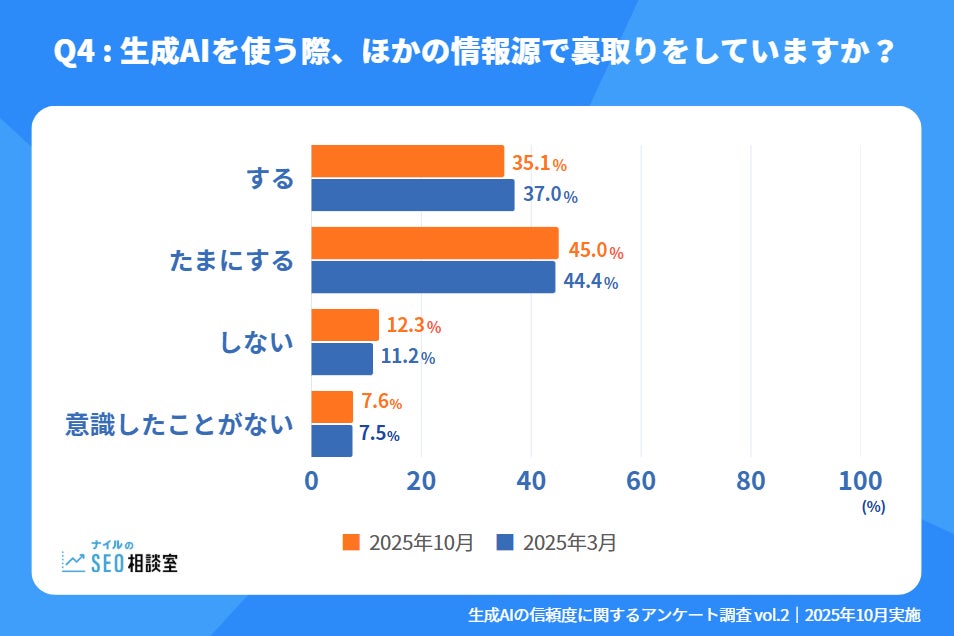 生成AIを使う際、他の情報源で裏取り(ファクトチェック)をしているか尋ねたところ、「している」(35.1%)、「たまにする」(45.0%)と、合わせて8割のユーザーが何らかの形で裏取りを行っていました。