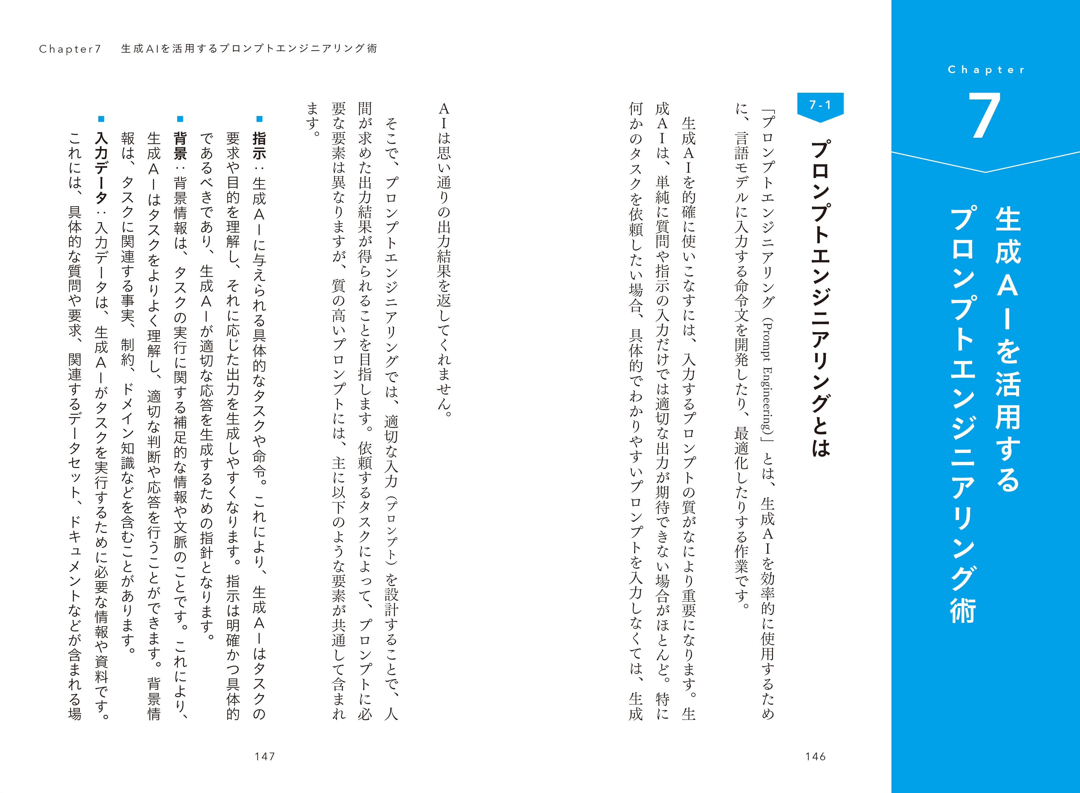 生成AIの代表格であるChatGPTを例に、AIからより正確で有効な回答を得るためのプロンプト(質問文)テクニックの実例集も収録しています。