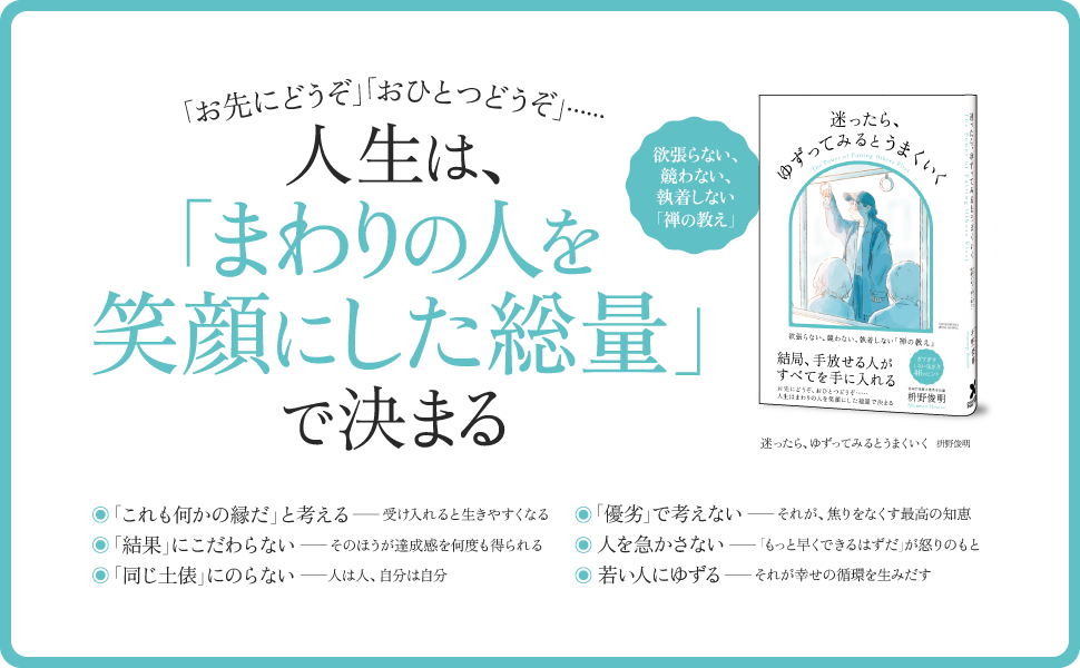 「早く」「もっと」から一歩引いて、「ゆるく」「楽に」生きる――。禅の教えを指針として、ゆとりある人生を歩むためのヒントが満載の本書。人間関係や仕事、勉強など、行き詰まりを感じたときに、ぜひ手に取ってみてください。「ゆずる」という選択肢が、多くの読者の方の人生を好転させるに違いありません。