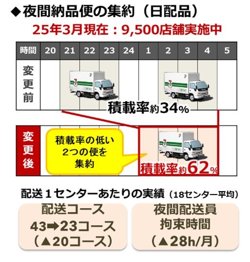 おにぎりやサンドイッチなどの日配品の夜間納品便を集約し、積載率と配送員の拘束時間を改善