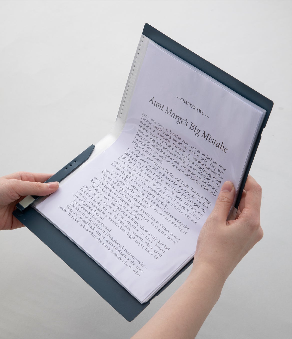 持ち運ぶ時や収納する時は半分に折ってコンパクトにでき、開くと通常のクリアーファイルと同様にポケットに入った書類をめくって閲覧できるファイルです。日本で販売している二つ折りクリアーファイル「コンパック」をベースにしています。