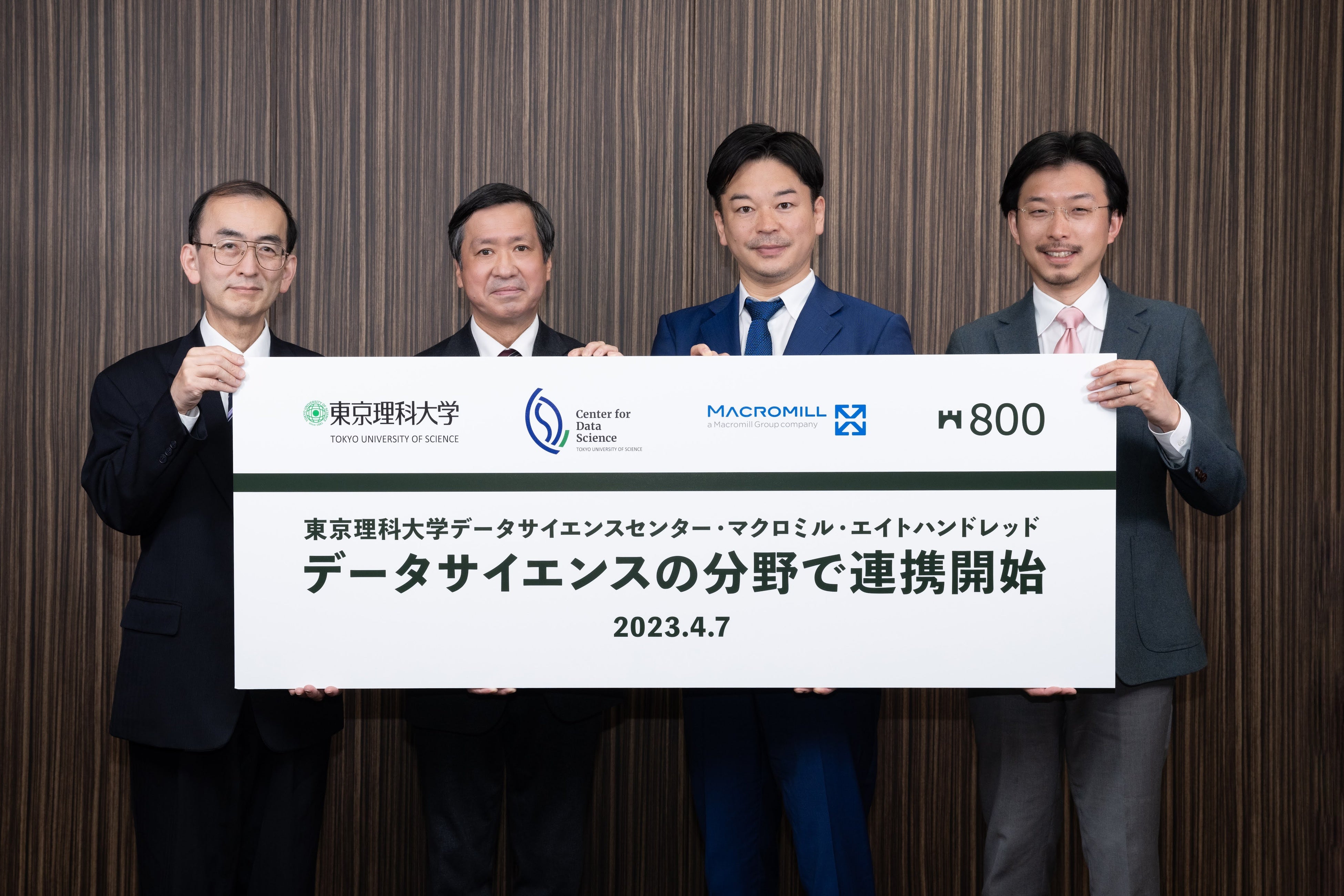 (写真左から)東京理科大学データサイエンスセンター 副センター長 村田貴司、東京理科大学データサイエンスセンター センター長 矢部博、株式会社マクロミル 代表執行役社長 グローバルCEO 佐々木徹、株式会社エイトハンドレッド 代表取締役社長 大畑翔柄