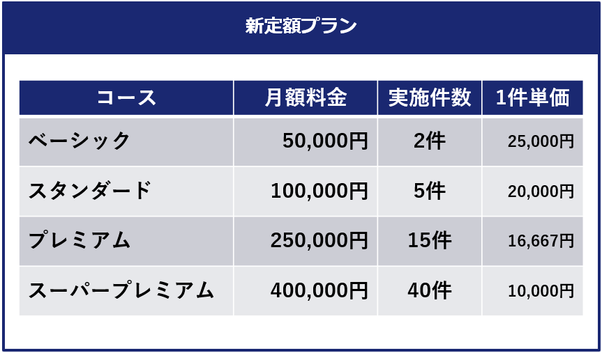 ・当月の実施件数を上回った場合、実施件数×各コースの「1名単価」を別途ご請求いたします。