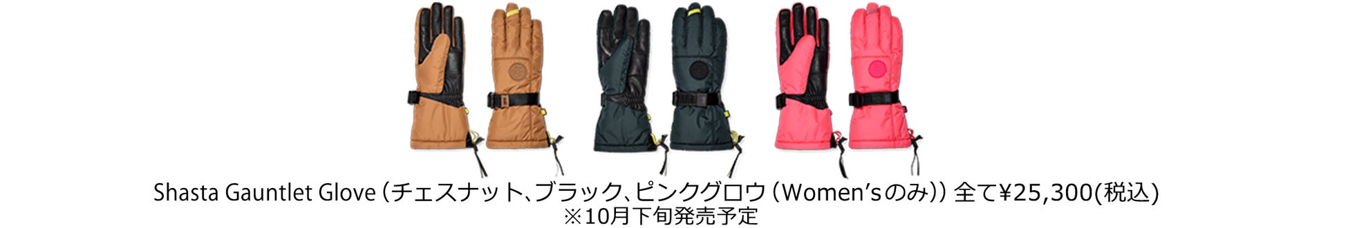 コレクションにはダウンと同じカラーで合わせられるShasta Gauntlet Glove(シャスタ ガントレット グローブ)も展開があり、女性用サイズは3色、男性用は2色で販売します。