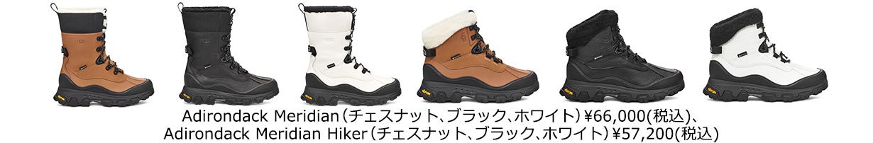 Adirondack Meridian(アディロンダック メリディアン) は、UGGファン待望のアディロンダック進化版で、マイナス32度までの防寒性と防水性に優れ、過酷なコンディションでも暖かく快適な履き心地を提供します。折り返し可能で防水加工を施したアッパーとマチのあるシュータンは雨や冷気が入り込むのを防ぎ、ハイテク素材GORE-TEX®のレイヤーは通気性も高く、ライナーとソックライナーの両方に暖かなアップサイクルウールブレンドUGGplush™を採用。Vibram®アウトソールにはICETREKコンパウンドを採用し、ストリートからゲレンデまで、滑りやすい路面や凍った路面でのトラクションを強化。Adirondack Meridianをショート丈にしたAdirondack Meridian Hiker(アディロンダック メリディアン ハイカー)は、マチ付きシュータン、GORE-TEX®のレイヤー、UGGplush™ライナー、Vibram®アウトソールなどの機能性が同じで、足首の屈曲性を高めるアシンメトリーなトップラインが特徴のトレッキングにも最適なブーツです。