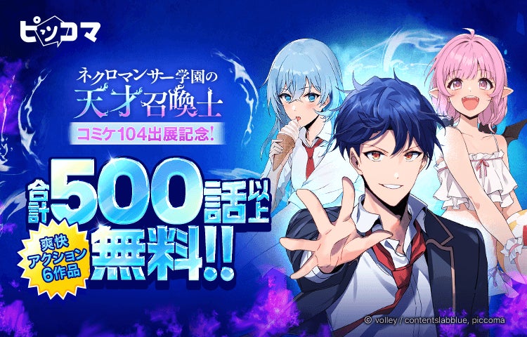 株式会社カカオピッコマ(本社:東京都港区、代表取締役社⻑:金在龍)が運営する電子マンガ・ノベルサービス「ピッコマ」では、8/10(土)から8/29(木)まで、独占配信中の人気学園ファンタジー『ネクロマンサー学園の天才召喚士』のコミケ出展を記念して、全ピッコマユーザーを対象に「ネクロマンサー学園の天才召喚士コミケ104出展記念!爽快アクション6作品合計500話以上無料!!」を実施いたします。