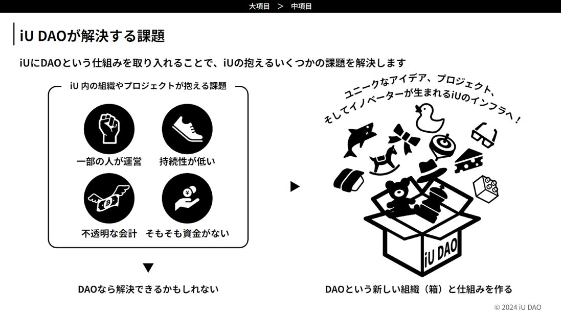 合同会社型DAOが4月22日に解禁されるにあたり、DAOが資金調達し収益分配を合法的に行う手段が定義されました。今回の「iU DAO」は、まずは大学の同窓会メンバーから、単純な寄付ではなく、将来的には配当も期待できる自律分散的な”コミュニティ”として立ち上がっていくことに特色があると思っています。