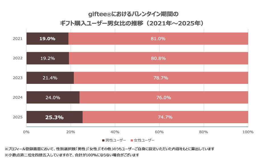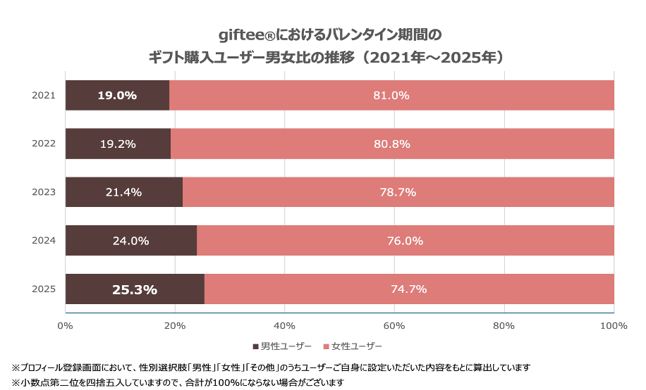 2021年から2025年の過去5年間のバレンタイン期間(2/13〜15)において、期間中に「giftee®」でギフトを購入したユーザーの動向を見ると、男性ユーザーの比率が年々増加していることがわかりました。2021年では、男性ユーザーの比率は全体の約19.0%であったところ、毎年継続して上昇し、2025年には25%を突破しています。バレンタインデーが、従来の「女性から男性へチョコレートを渡して想いを伝えるイベント」から、ビジネスシーンでの活用やシーズナルな挨拶、大切な方にキモチを伝えるきっかけとして、性別にとらわれないイベントへと少しずつ変化していると考えられます。