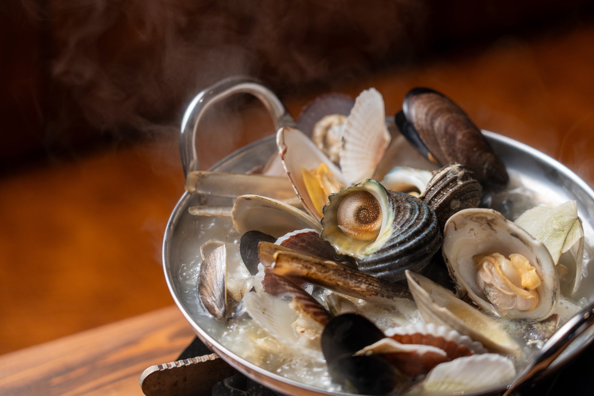冷たい状態でお席にご用意し、ふつふつと煮立ったところで蓋を開ければ濃厚な魚貝の香りがふわっと広がります。
