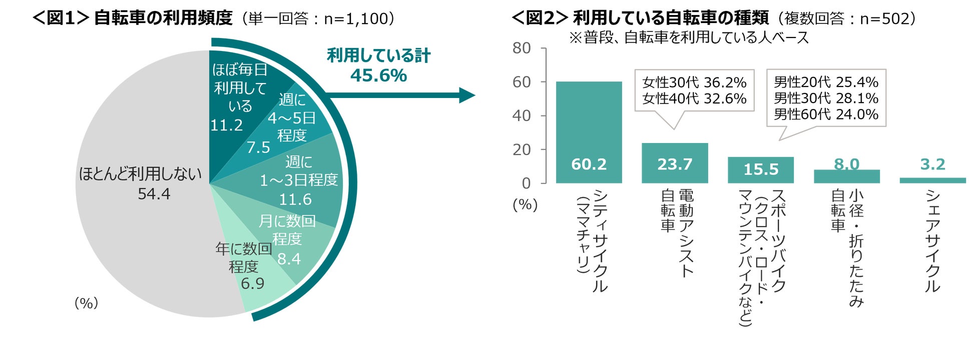 普段、自転車を「利用している」人は45.6%で、「ほぼ毎日利用している」は11.2%。<図1>
