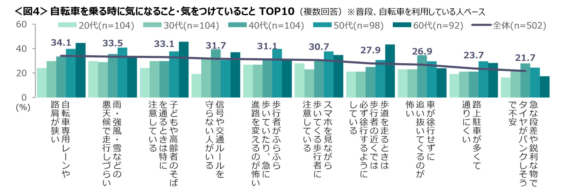 年代が上がるにつれ気になること、注意している傾向にあり、60代では「自転車専用レーンや路肩が狭い」「子どもや高齢者のそばを通るときは特に注意している」「歩道を走るときは歩行者の近くでは必ず徐行する」が4割を超える。<図4>