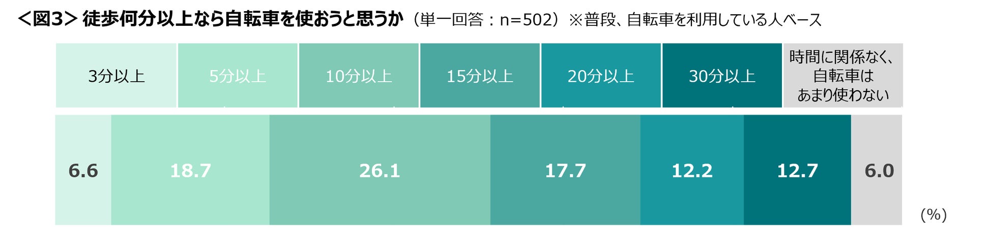 徒歩何分以上なら自転車を使うかを聴取したところ、「10分以上」が26.1%で最多。<図3>