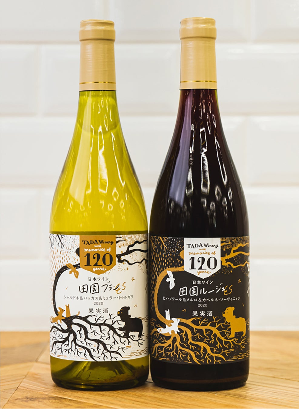 2021年で120年目を迎えた「多田農園」を記念して造られた"田園シリーズ"。自社栽培のブドウをそれぞれ3種類ずつブレンドして、この地を特長的に表現!ミネラル豊富な北の大地で手間を惜しまず大切に育てたブドウ品種で醸造した白ワインと赤ワイン。