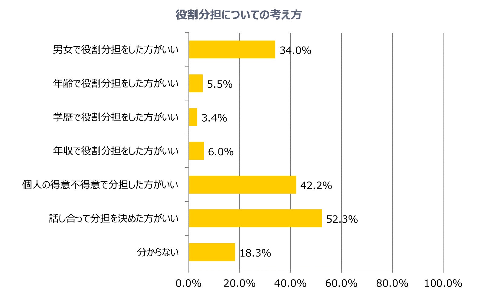 また、性別以外の属性、「年齢」(5.5%)、「学歴」(3.4%)、「年収」(6.0%)、などで役割分担をした方がいいと考える人はそれぞれ一桁台でした。