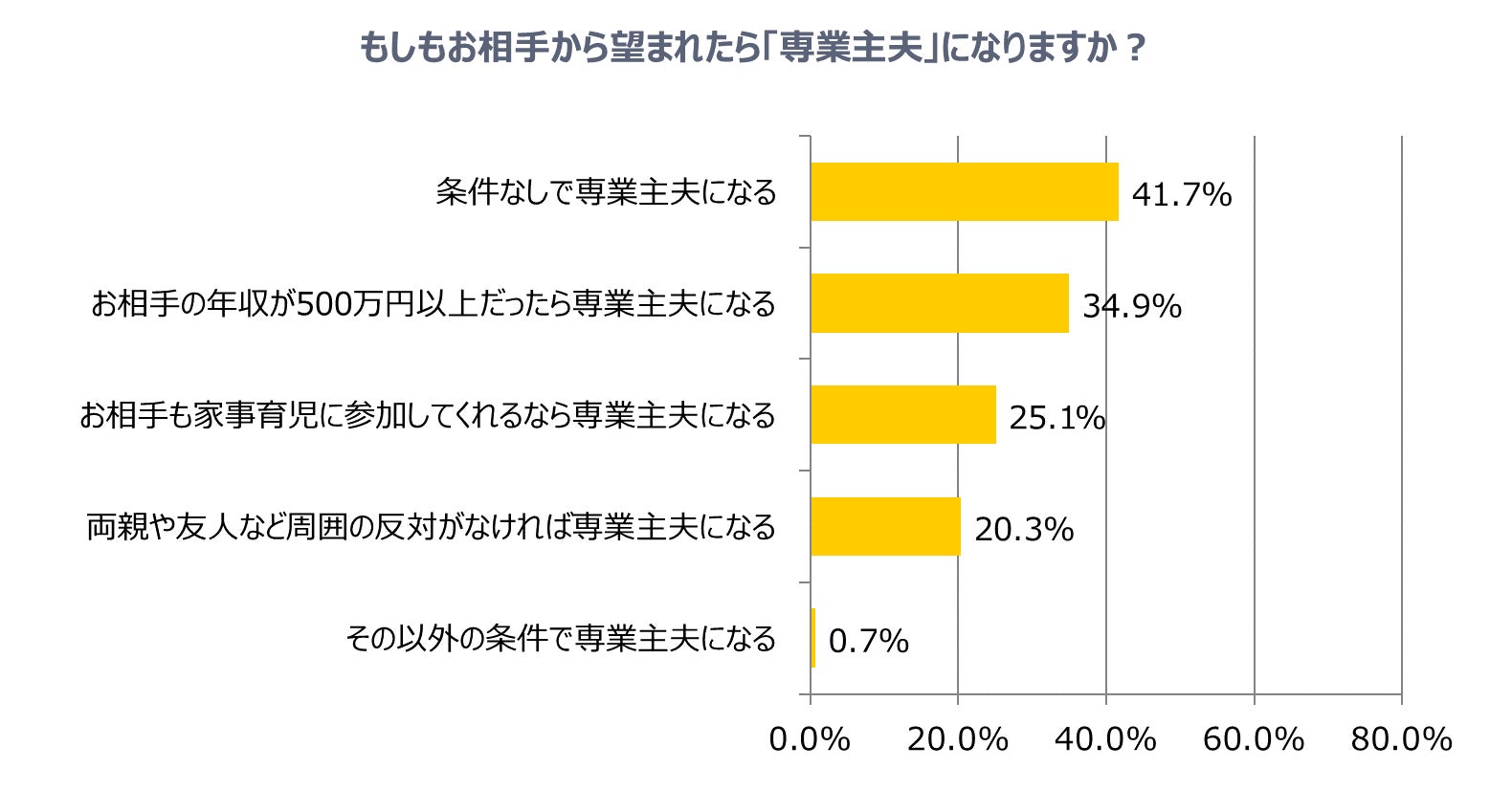 「お相手の年収が500万円以上だったら専業主夫になる」と答えた人は34.9%、「お相手も家事育児に参加してくれるなら専業主夫になる」という人は25.1%でした。