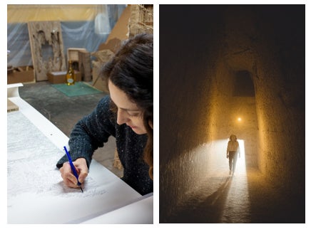 地下の世界に魅⼒を感じていたエヴァは、ルイナールの⽩亜質のセラー「クレイエル」を訪れ、深く感銘を受けます。根、深さ、地層に魅了された彼⼥は、上下をつなぐ感覚や彫刻に興味を持ち、それが彼⼥の「カルト・ブランシュ」の核となっています。
