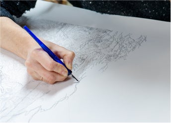 森のモニュメントを表現したカードボード彫刻が有名な彼⼥ですが、墨絵も彼⼥の作品において重要な役割を担っています。単なる下絵ではなく、それ⾃体が芸術作品です。今回の「カルト・ブランシュ」では、浮き彫り地図や地図製作に着想を得て、キャンバスにレリーフ状の絵を描いたシリーズを制作しました。