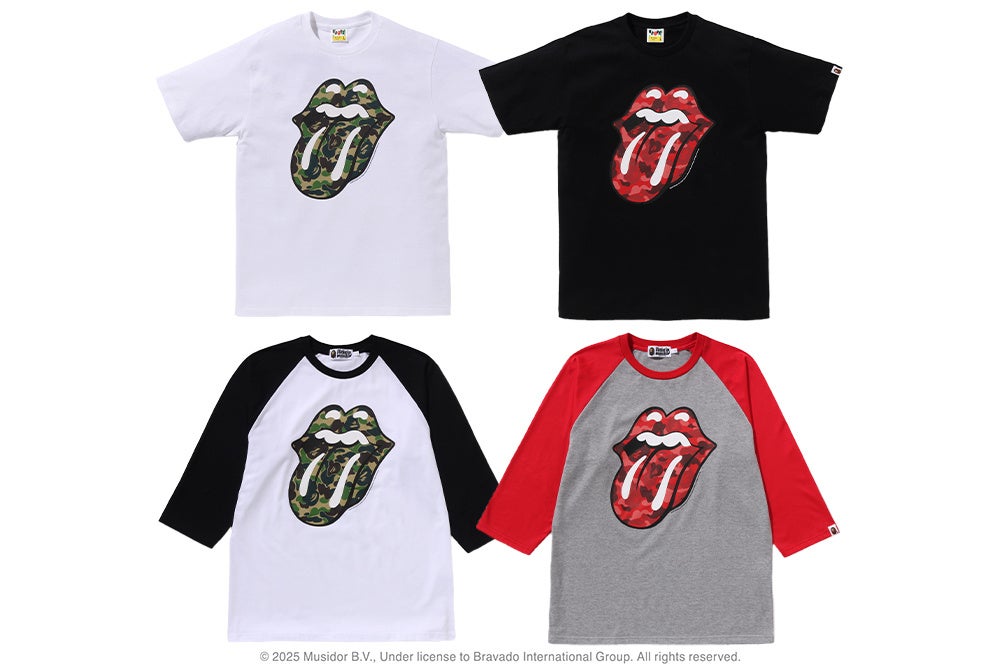 今回ラインアップするTシャツとラグランシャツは、2012年にTHE ROLLING STONESのバンド結成50周年を記念して登場したアイテムの完全復刻版です。バンドの象徴である“リップス&タン”にBAPE®のオリジナルカモフラージュ柄“BAPE®︎ CAMO”をミックスしたグラフィック“Camo Tongue”を、フロントに大胆にプリントしています。