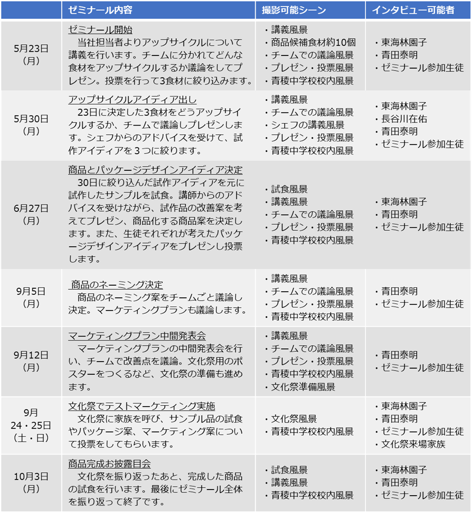 生徒はゼミナールで、5月はアップサイクルについて学んだあと、商品開発に向けてアップサイクルをする食材とその活用方法を考えます。6月に食材と商品パッケージ案のコンテストを行い、夏休みの課題を挟んで9月には商品のネーミングを決定します。それ以降は文化祭で家族に商品サンプルを食べてもらって感想を聞くなど、10月の販売開始に向けてマーケティングプランを練り上げていく予定です。
