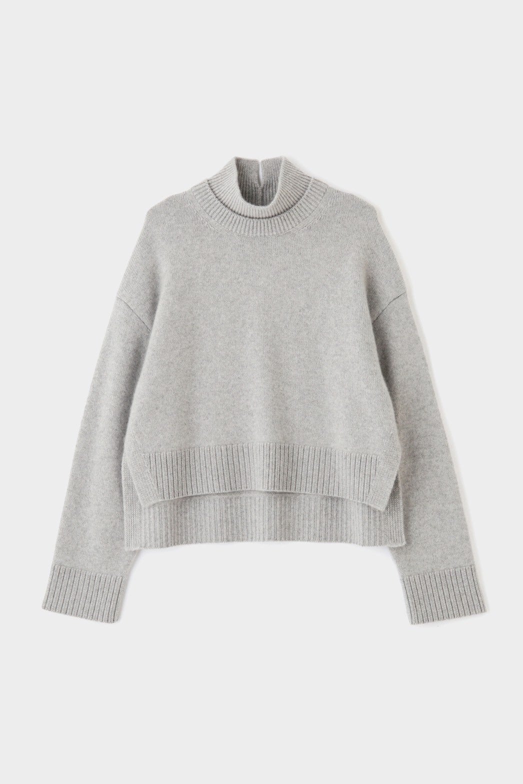 最高級カシミヤを使用し、丸首にタートルネックを合わせたようなデティールのデザインニット