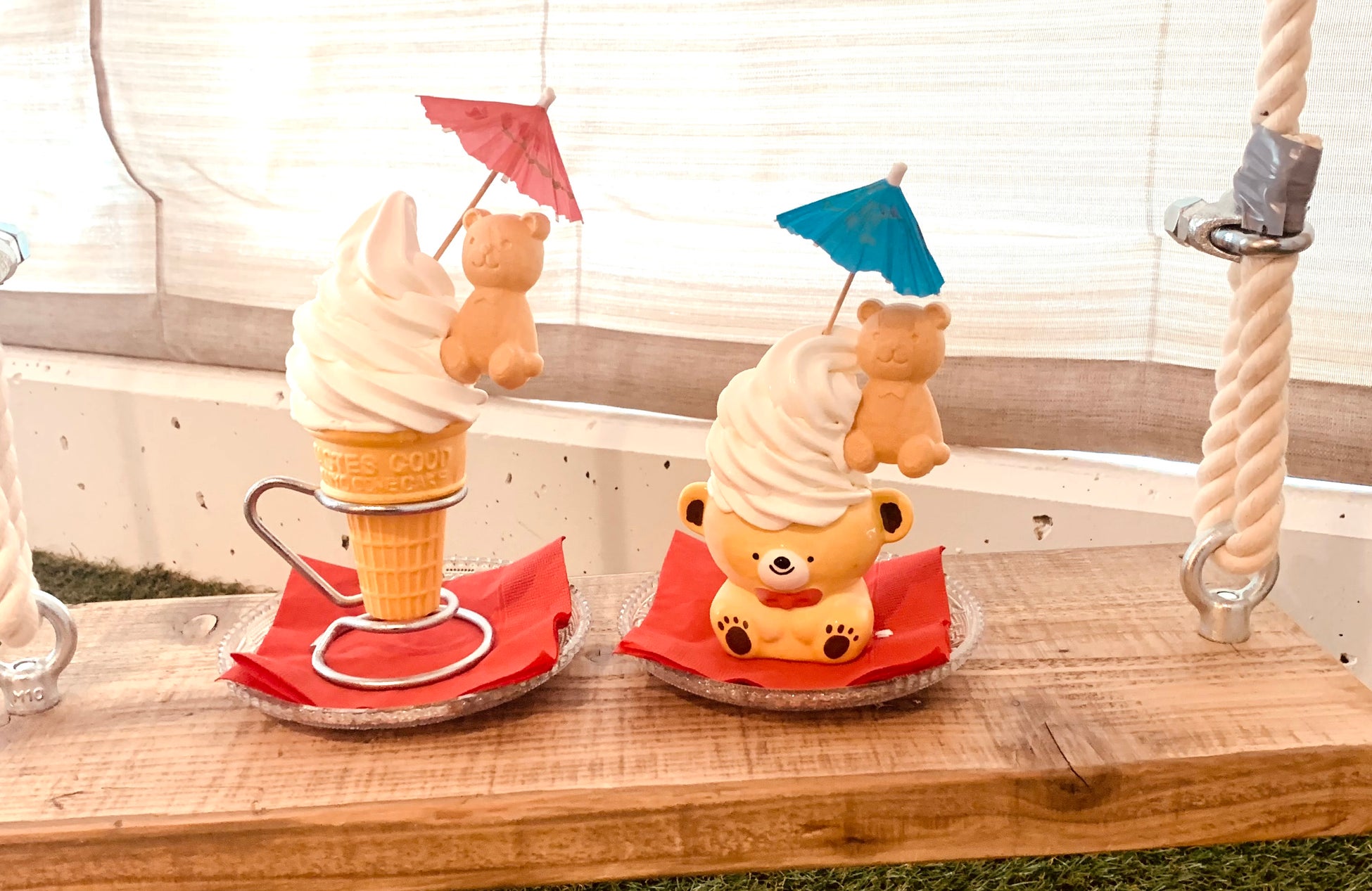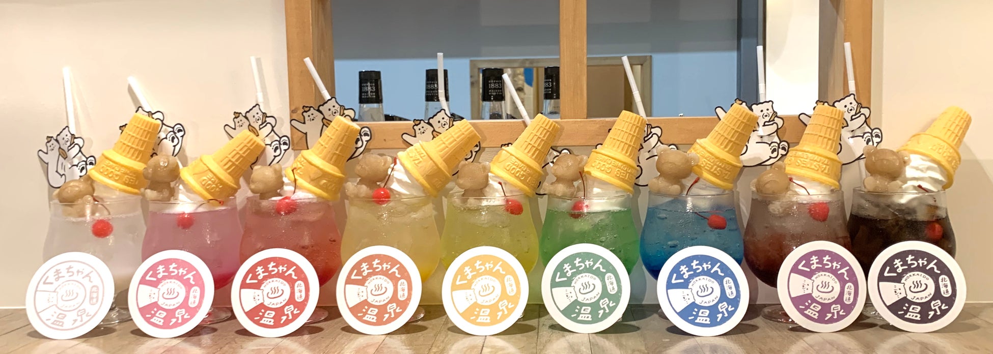 北海道を表現したアートが出迎える入口を抜けると、そこにはかわいい“くまちゃん”の世界が広がっています。湯上りに立ち寄ることをイメージした「くまちゃん温泉 おやすみ処」はフォトスポットが満載で、色とりどりのかき氷やクリームソーダ、ソフトクリームなど豊富なカフェメニューをご用意しております。くまちゃん形をした、森を思わせる大きなかき氷は、食べ進めていくと、最後まで美味しく食べていただける仕掛けが隠されています。“めんこい”(かわいい)くまちゃんと共に、ひとときの涼を味わってみてはいかがでしょうか。