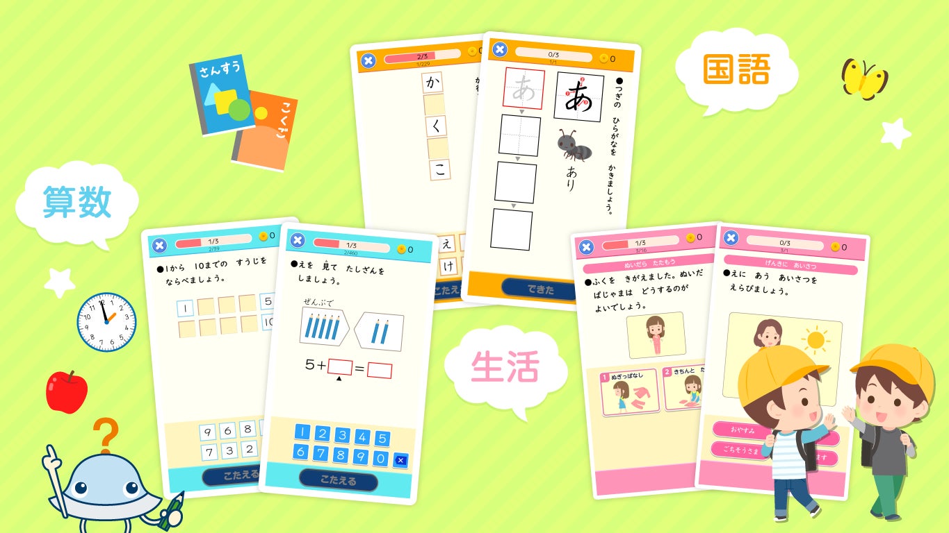 小学校での国語と算数の土台となる「もじ」と「かず」を楽しく学習できる、小1、小2相当の国語・算数の問題に加え、あいさつやマナー、交通ルールなど、家庭や学校の生活で役立つ問題も搭載。